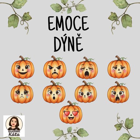 Sada obrázků dýní s různými obličejovými výrazy, které znázorňují základní emoce (radost, hněv, vyčerpání, znuděnost, smutek, překvapení, stydlivost, strach, zamilovanost ). Materiál je určen pro děti v mateřské škole a pomáhá jim hravou formou rozpoznávat a pojmenovávat pocity, rozvíjet emoční inteligenci a komunikaci. Lze s nimi hrát i různé hry v komunitním kruhu.