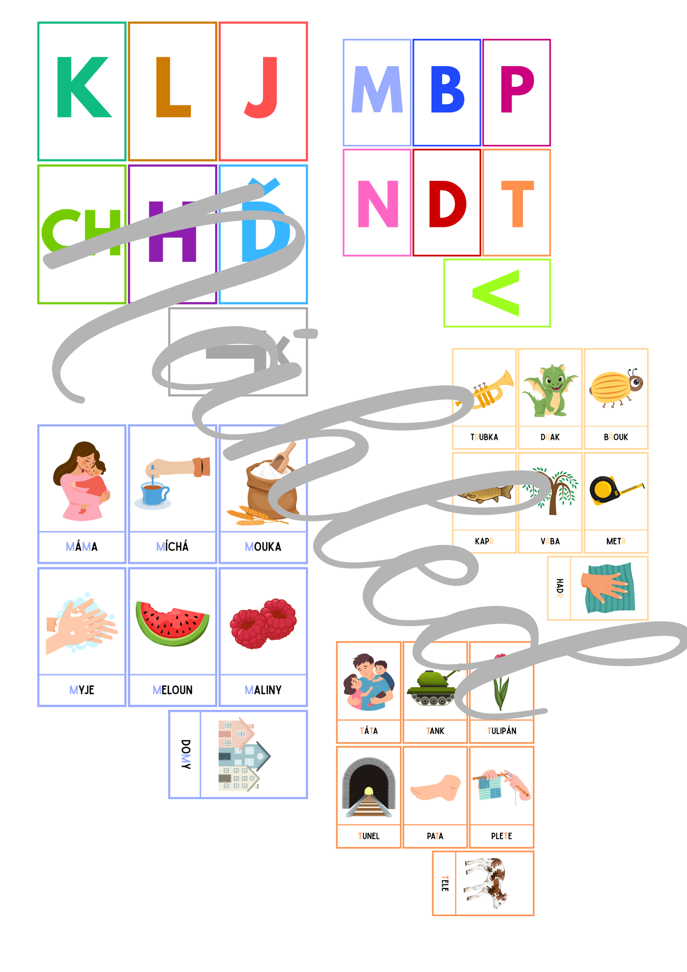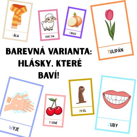 Tato sada kartiček je jako jazyková duha – každá hláska má své místo, svou barvu a svůj obrázek. Děti se učí poznávat hlásky M, B, P, N, D, T, F, V, K, L, J, CH, H, Ď, Ť, Ň, C, S, Z, Č, Š, Ž, R, Ř pomocí 7 obrázků ke každé z nich. Ve slově je daná hláska barevně zvýrazněna, takže ji děti snadno najdou a slyší.