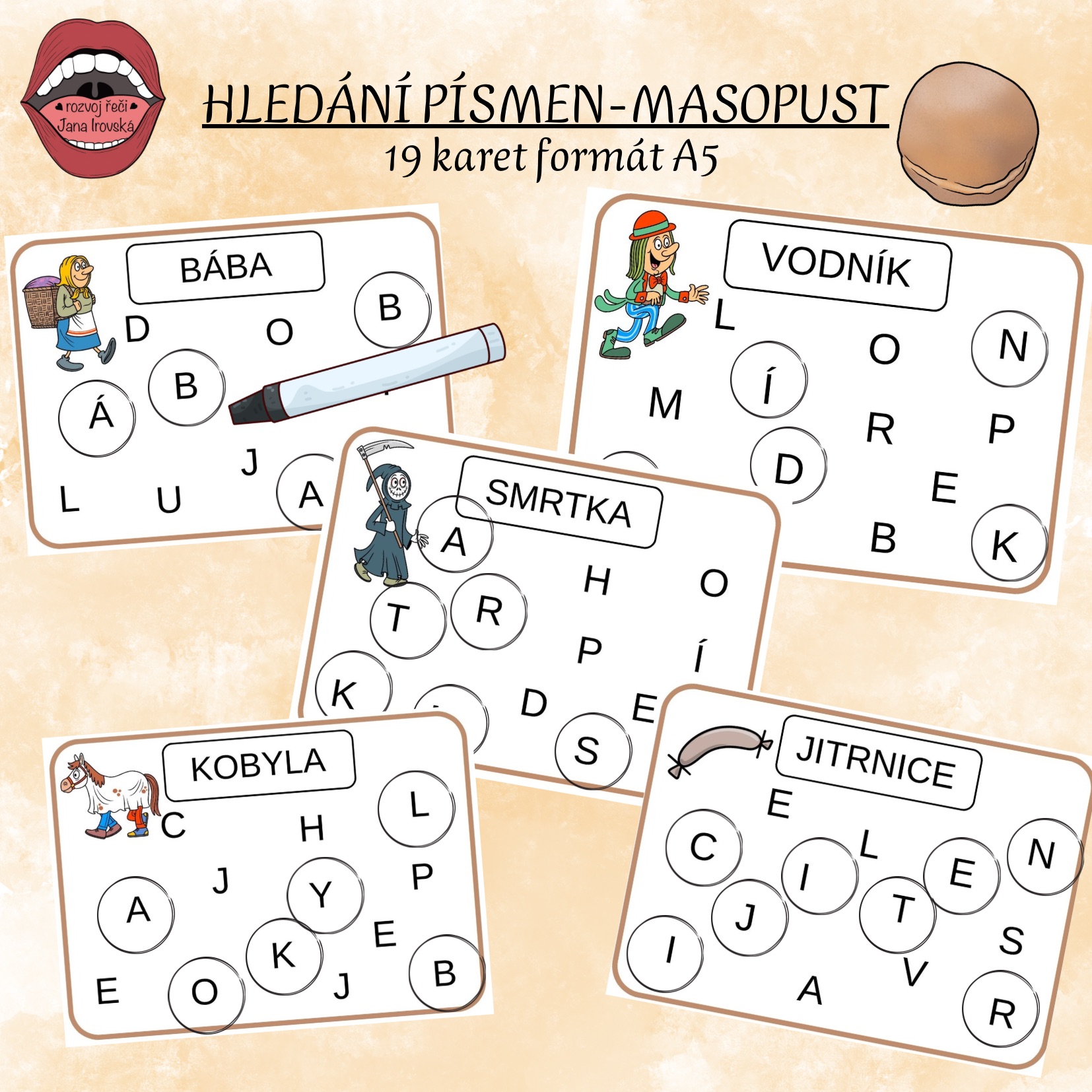 Soubor obsahuje 19 karet s masopustními obrázky a jejich názvy. Děti mají za úkol zakroužkovat smazací fixou písmena tak, aby z nich vzniklo dané slovo.