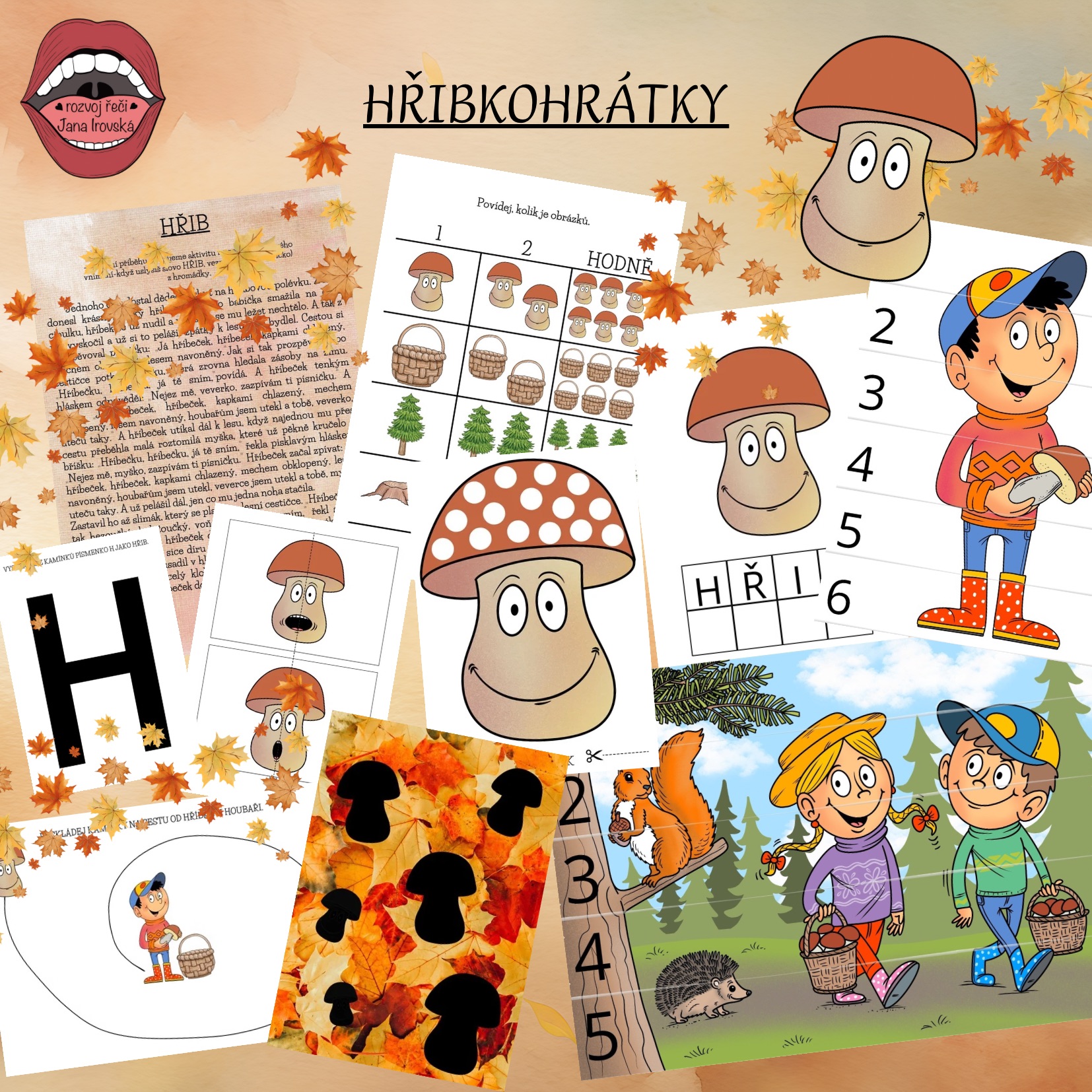 Soubor obsahuje pohádku HŘIB se sluchovým cvičením, oromotorické skládačky s hříbky, slabikování, dechové cvičení, cestičky k přikládání kamínků, kolíčkování, skládačky podle čísel, omalovánky.