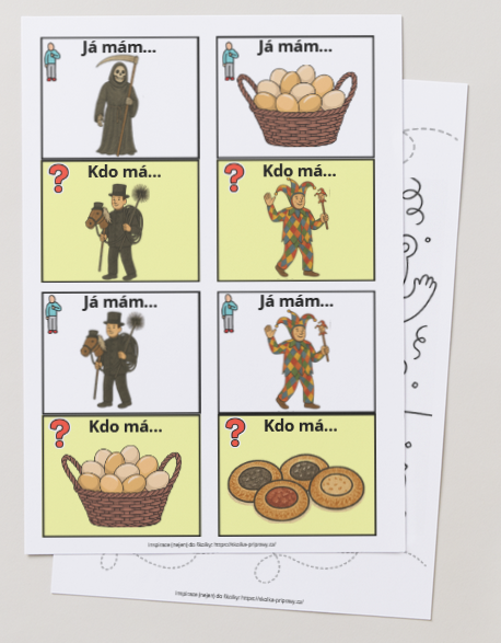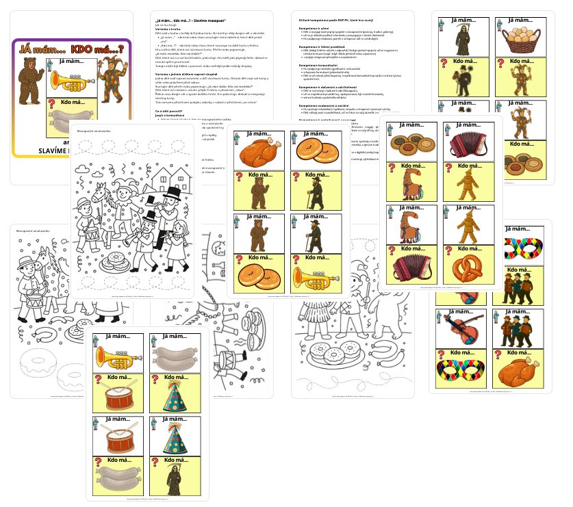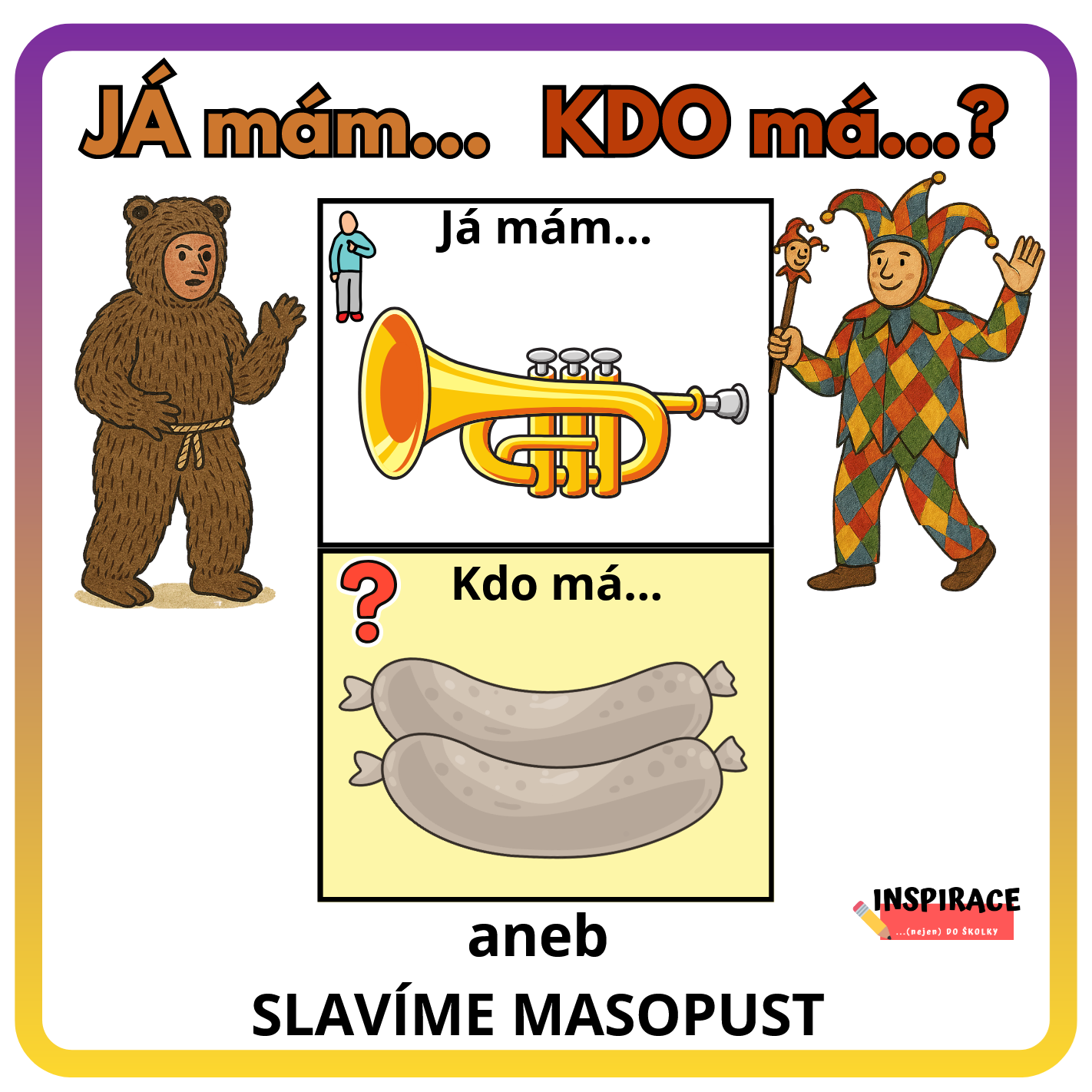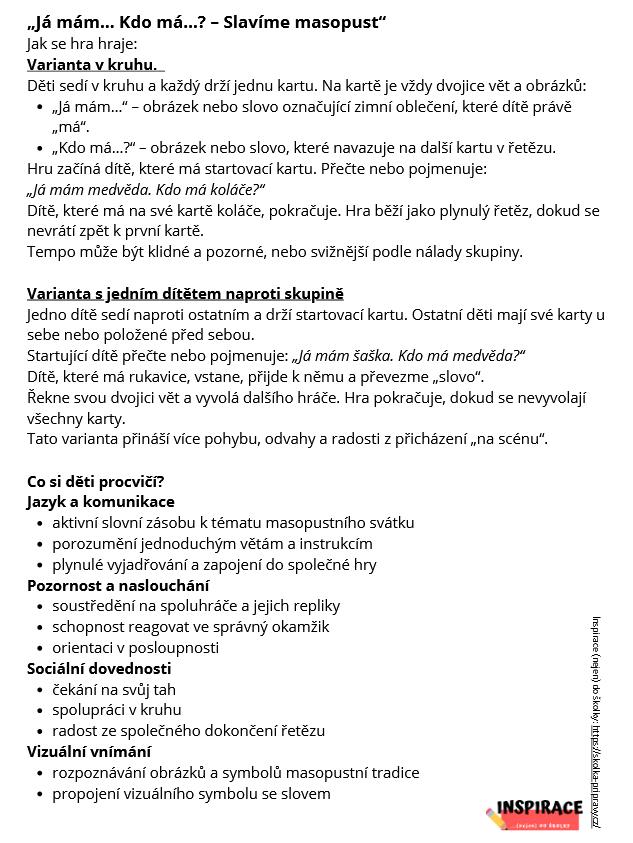 „Já mám, kdo má – Masopust“ je skupinová řetězová hra, která dětem přibližuje masopustní tradice hravou a srozumitelnou formou. Podporuje rozvoj slovní zásoby, pozorného naslouchání a schopnosti reagovat ve správný okamžik. Děti se učí spolupracovat, respektovat pravidla a vnímat rytmus společné aktivity.