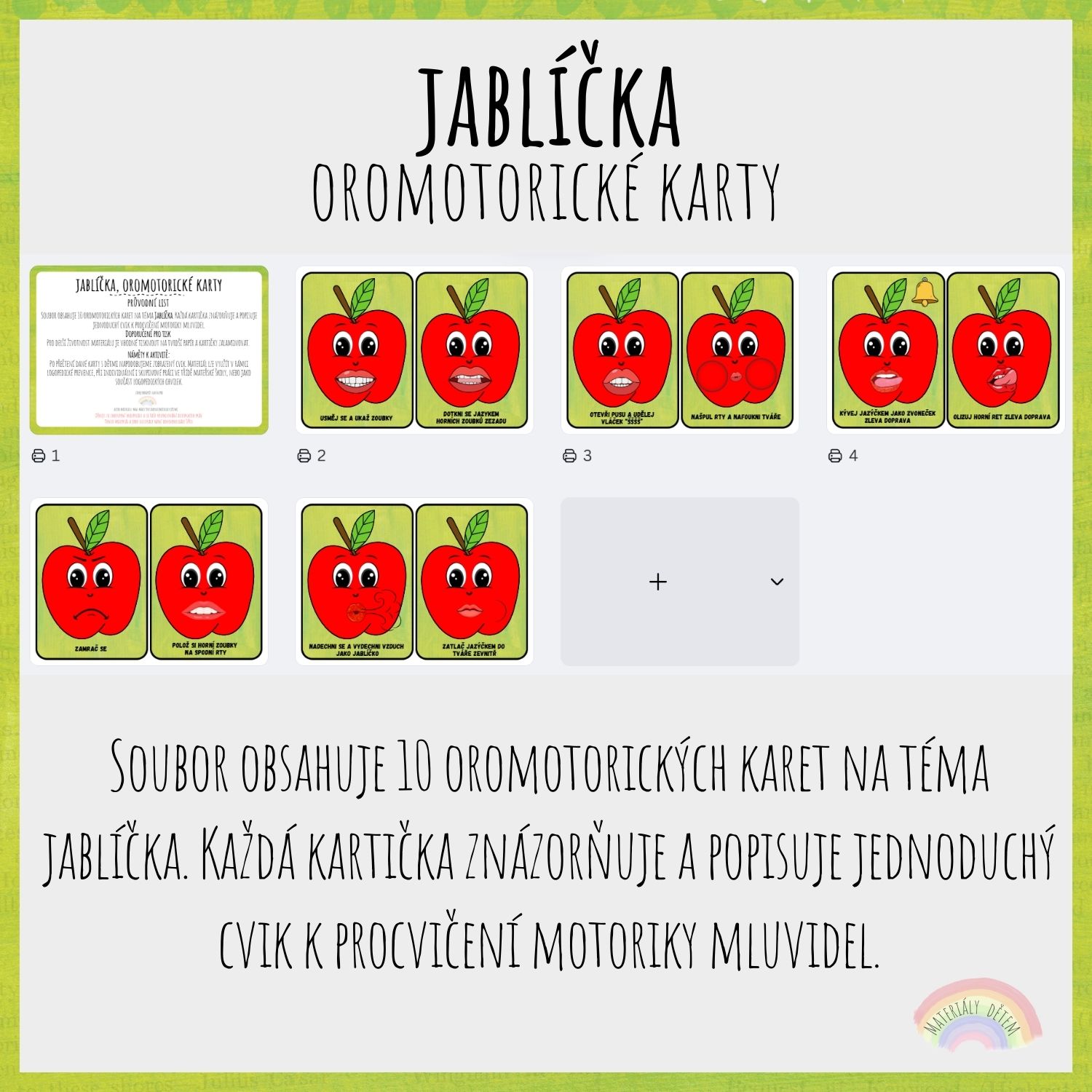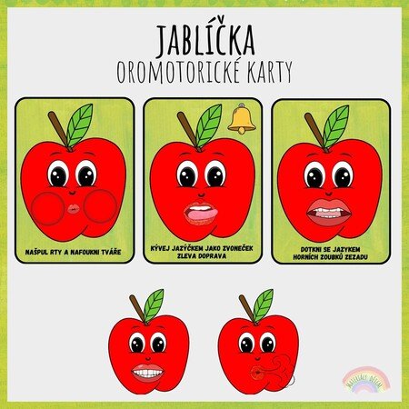 Soubor obsahuje 10 oromotorických karet na téma Jablíčka. Každá kartička znázorňuje a popisuje jednoduchý cvik k procvičení motoriky mluvidel.