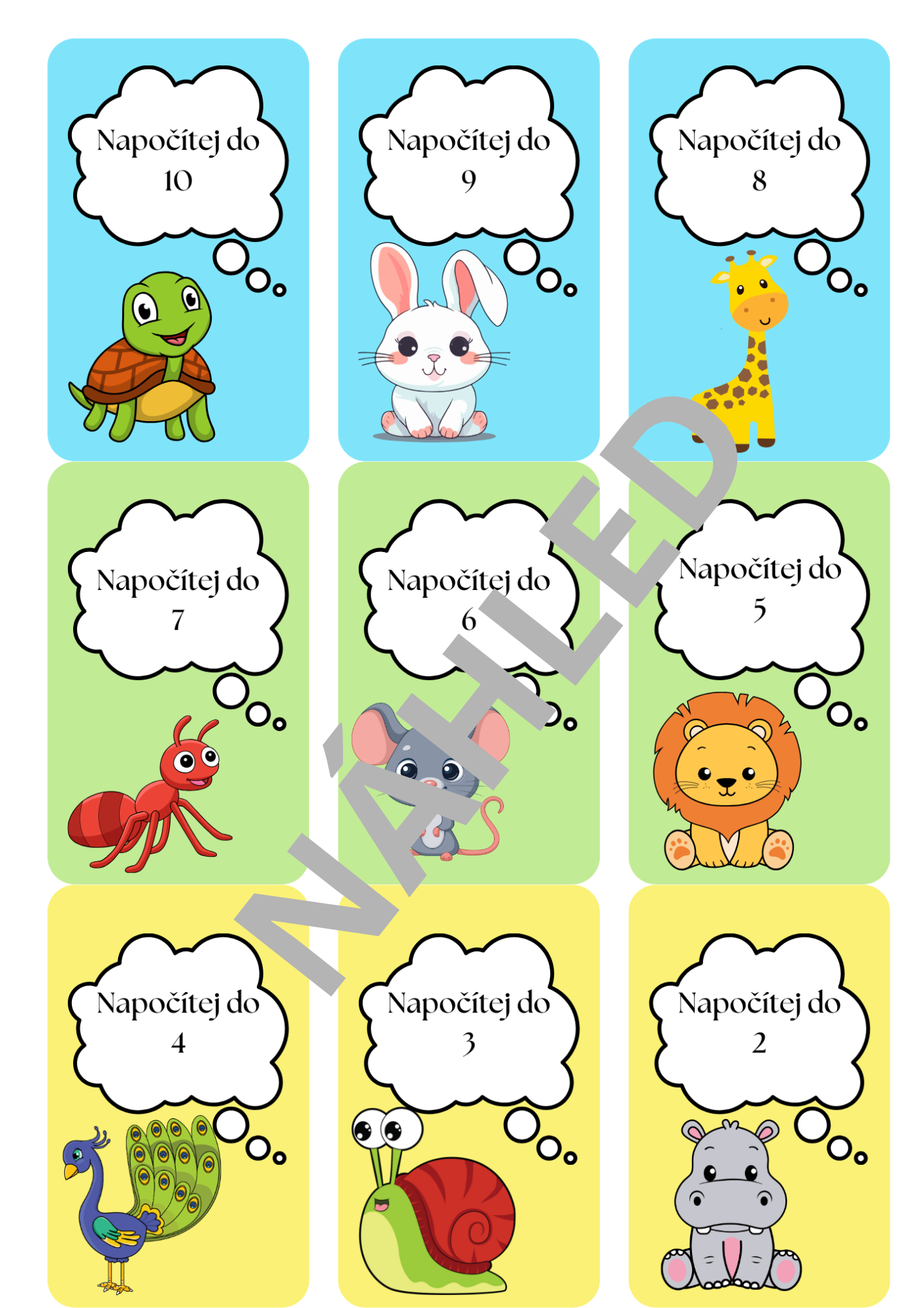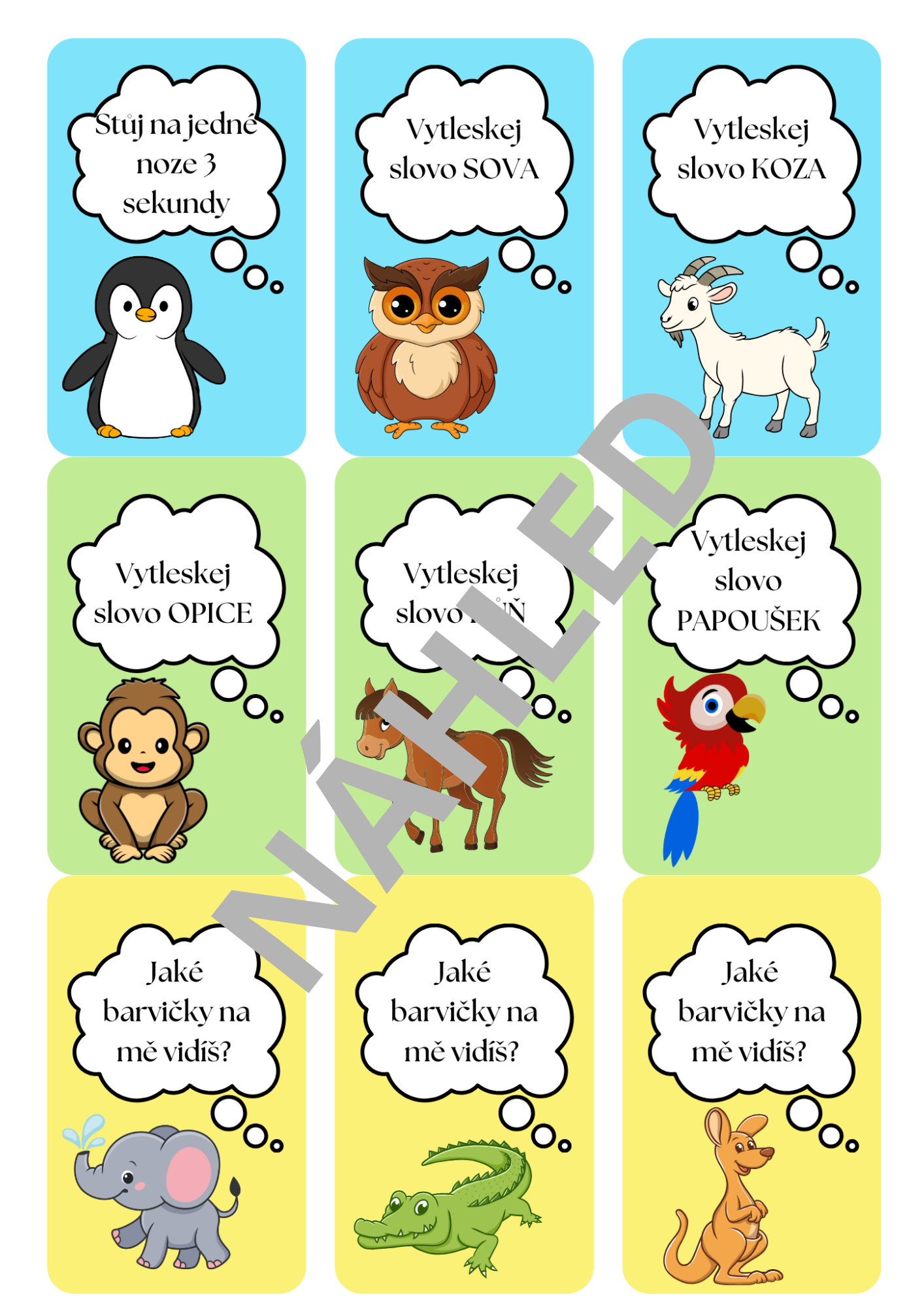 Na každé kartičce je vyobrazené zvířátko, které pokládá otázku.