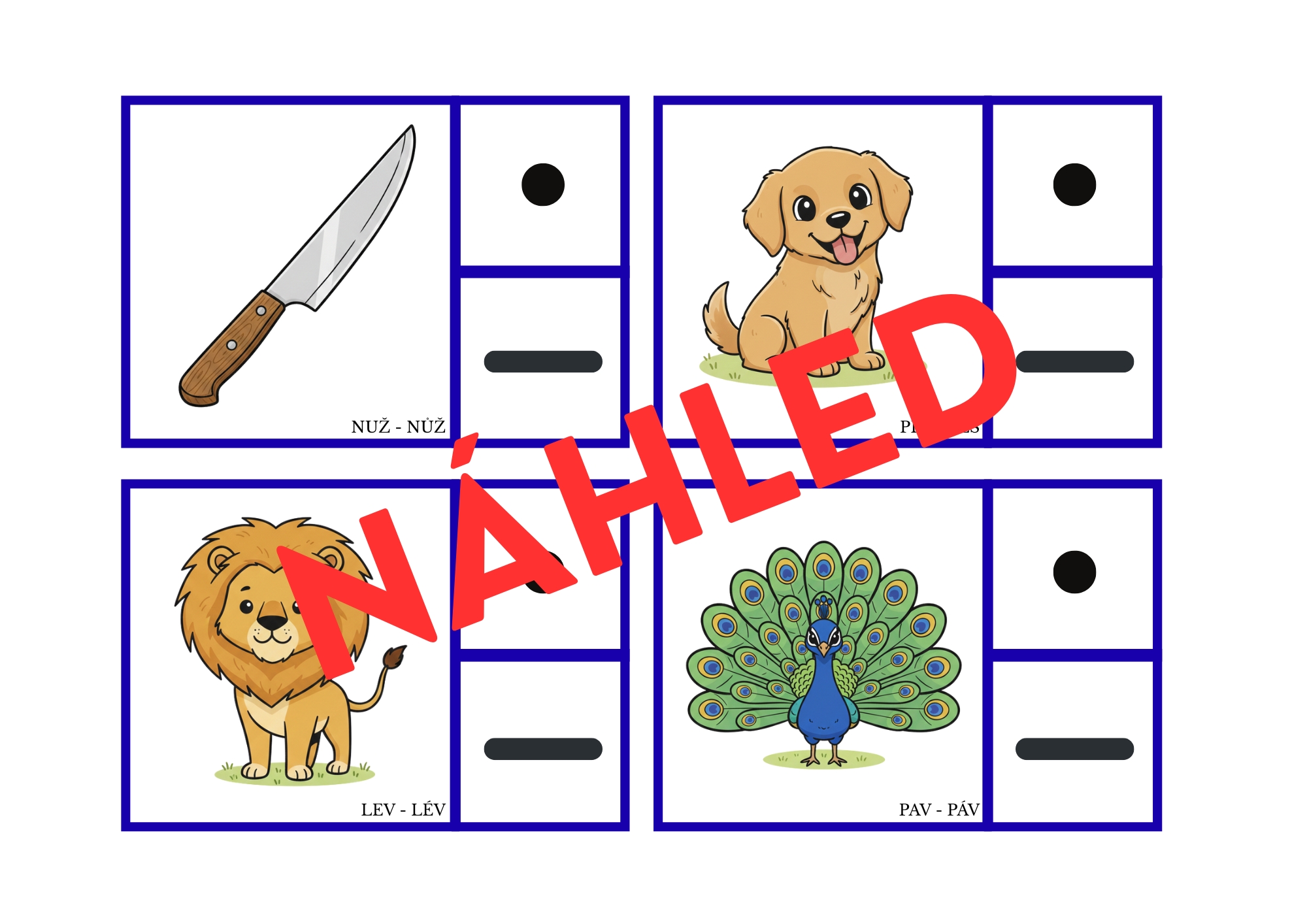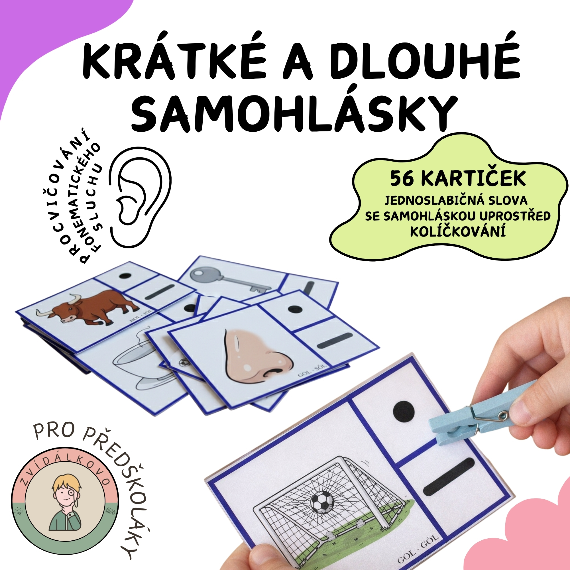 Zvídálkovo Krátké a dlouhé samohlásky je soubor 56 kartiček vhodných na kolíčkování, při kterých si děti procvičují sluchové vnímání - fonematický sluch.