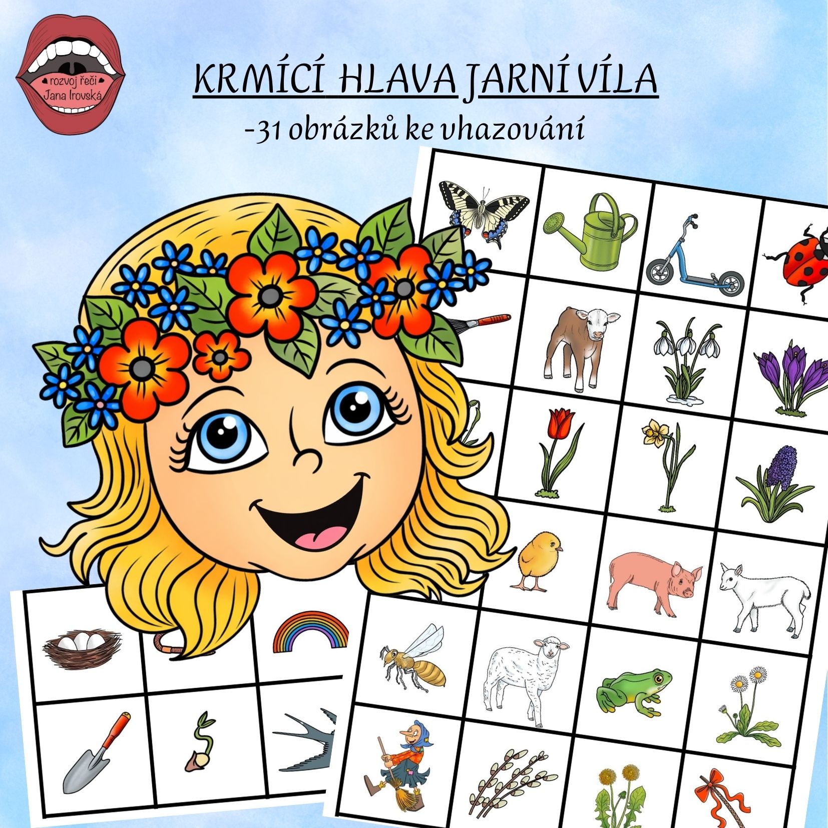 Soubor obsahuje hlavu jarní víly a jarní obrázky. Děti vhazují obrázky do pusy a říkají, co se děje na jaře. Nebo vytleskají slovo a vhodí daný počet kamínků.