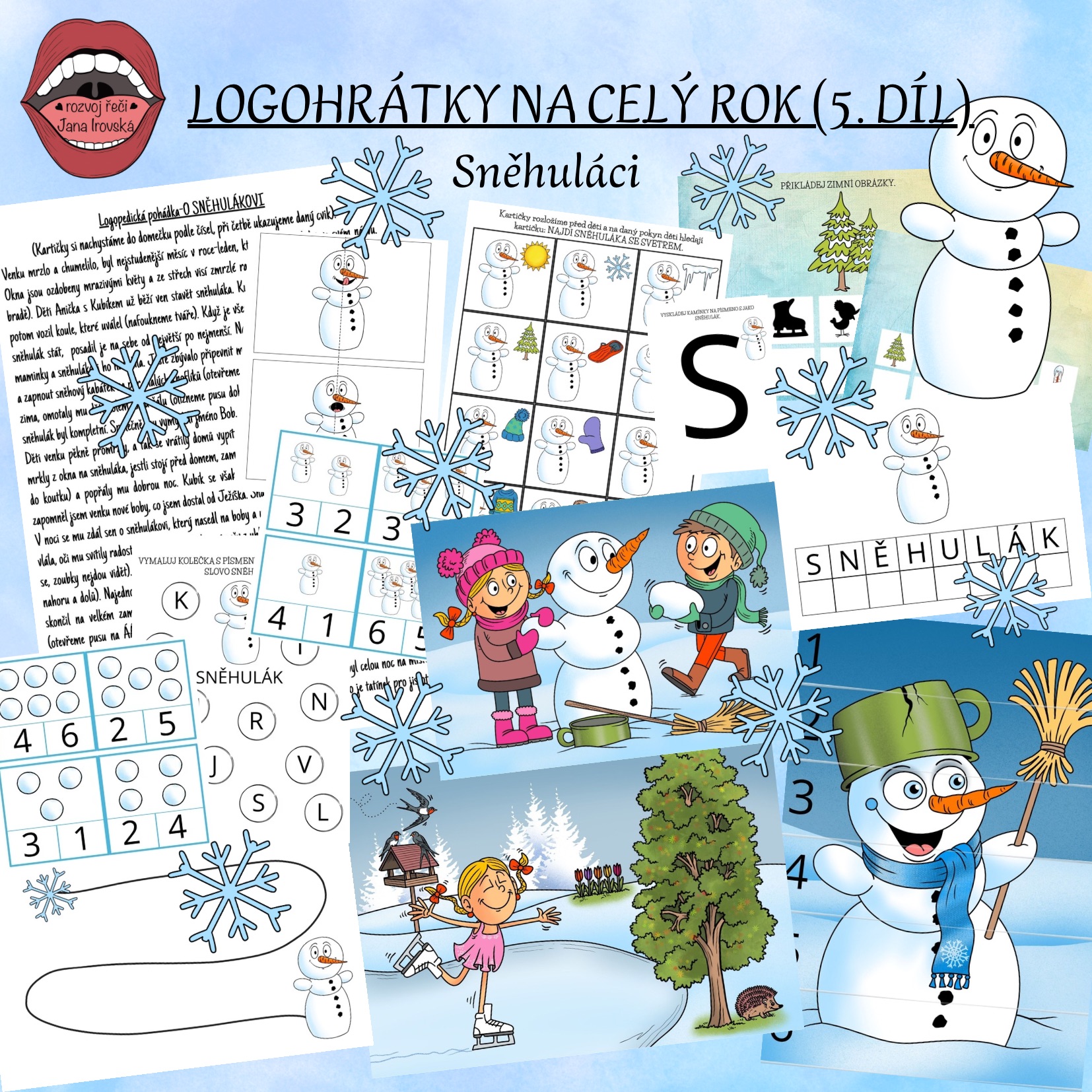 Logohrátky na celý rok provází děti Anička s Kubíkem a jejich příběhy, které jsou každý měsíc tematicky zaměřené podle ročního období. Soubor obsahuje příběh O SNĚHULÁKOVI s oromotorickými cviky, dechové cvičení, omalovánky, slabikování, skládací obrázky, kolíčkování, skládání slov, kamínkové cestičky atd.