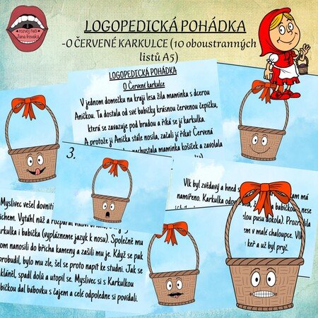 Logopedická pohádka: O ČERVENÉ KARKULCE obsahuje 11 oboustranných karet (formát A5) s příběhem a oromotorickými cviky.