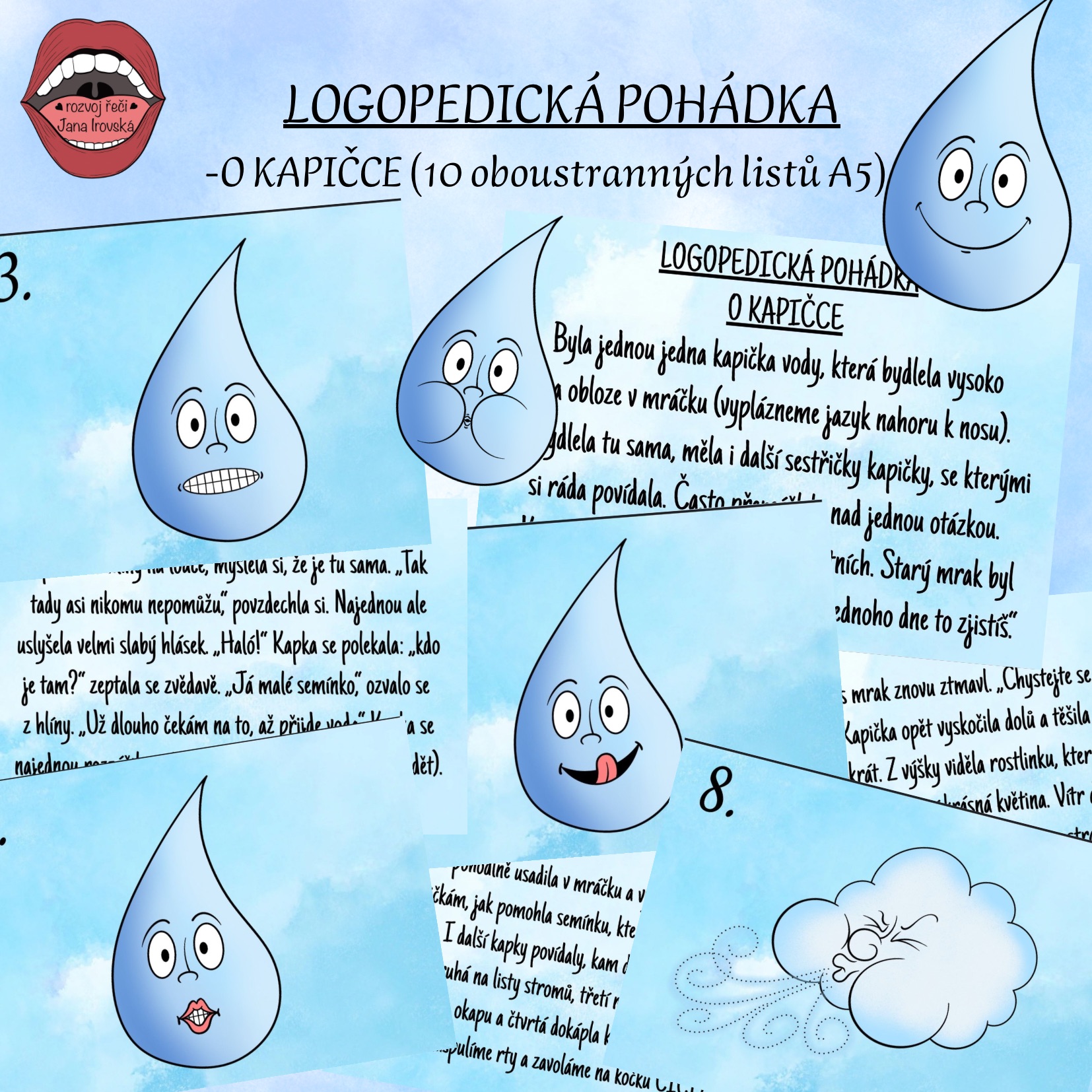 Logopedická pohádka: O KAPIČCE obsahuje 10 oboustranných karet (formát A5) s příběhem a oromotorickými cviky.