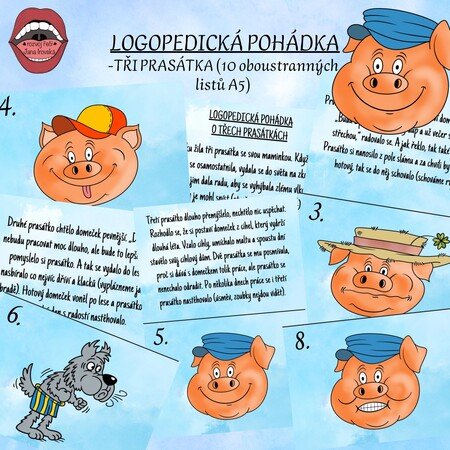 Logopedická pohádka: TŘI PRASÁTKA obsahuje 10 oboustranných karet (formát A5) s příběhem a oromotorickými cviky.