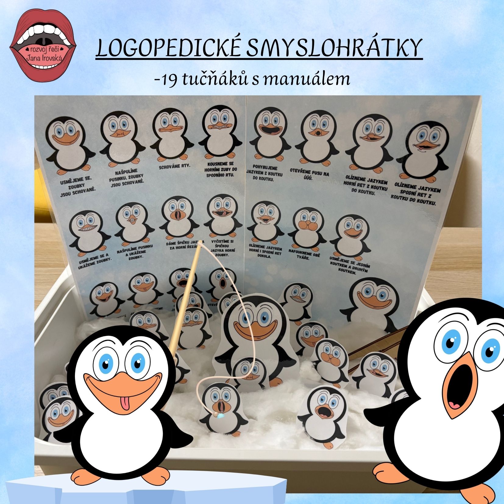 Soubor obsahuje 19 tučňáků, které vložíme do boxu s bílými kamínky, děti hledají obrázky a poté předvedou cvik, můžou přenášet pinzetou nebo lovit hadicí (na tučňáky přicvakneme kancelářskou sponu).