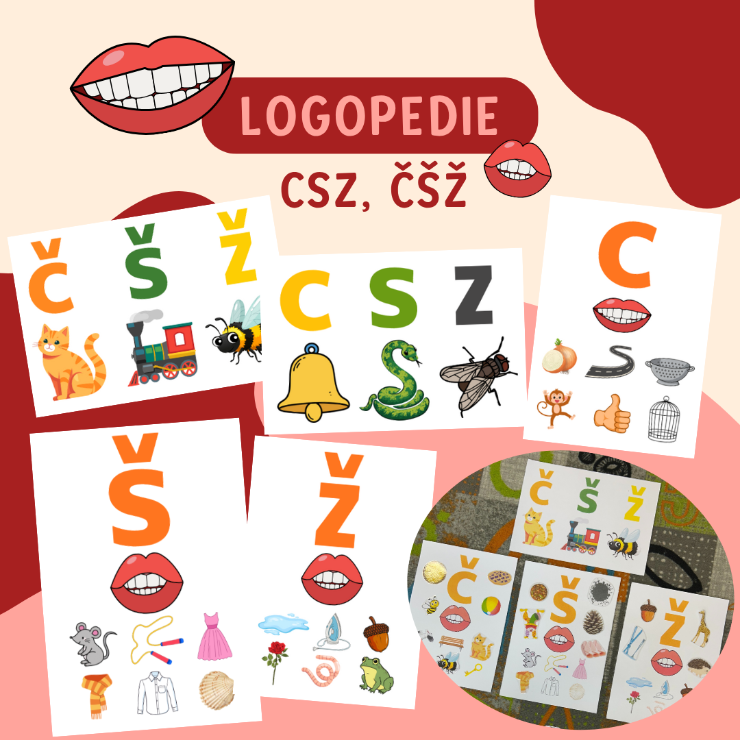 - Listy s jednotlivými hláskami, správnými pozicemi úst a obrázky souvisejícími s danou hláskou.