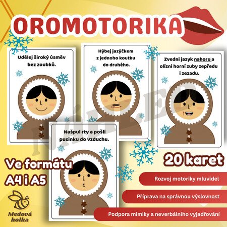 Tento PDF soubor obsahuje celkem 20 oromotorických kartiček, které jsou laděny do zimního motivu eskymáků. Díky kartičkám se z procvičování stává větší zábava, a děti tak napodobují legrační výrazy, smějí se, šklebí, posílají pusinky a trénují mluvidla, aniž by si to tolik uvědomovala. Tato cvičení pomáhají dětem rozhýbat rty, jazyk i tváře, které jsou důležité pro správnou výslovnost.