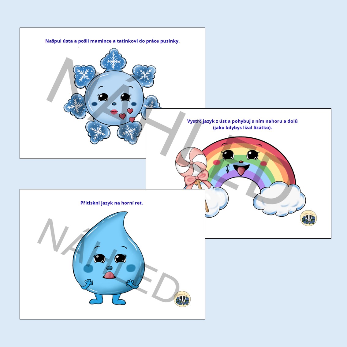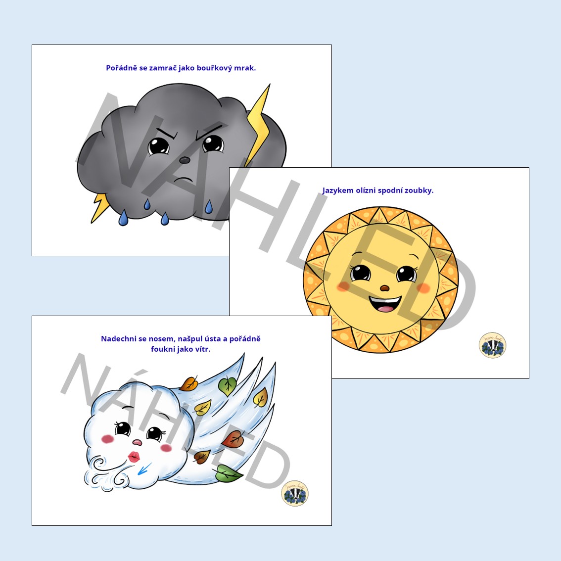 ♥ 20 karet zaměřujících se na rozvoj oromotorických a logopedických dovedností. Tyto cviky jsou namotivované veselými tematickými obrázky - mrak, vločka, kapka, duha, vítr a slunce.