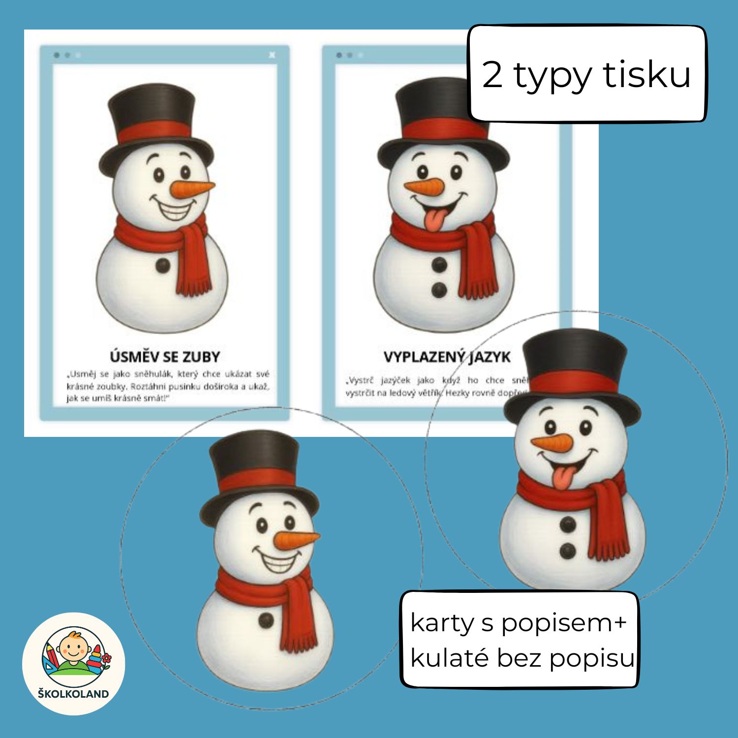 - Barevné karty se sněhulákem (každý cvik na samostatném obrázku).