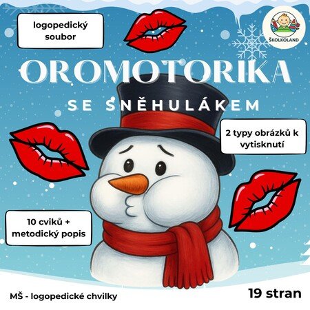 Tento soubor přináší sadu krásně ilustrovaných oromotorických karet, na kterých sněhulák předvádí různé pohyby mluvidel: široký úsměv, pusinku, cenění zubů, velké O, vyplazování jazyka, boule v tváři, pohyb jazyka do strany a mnoho dalších.