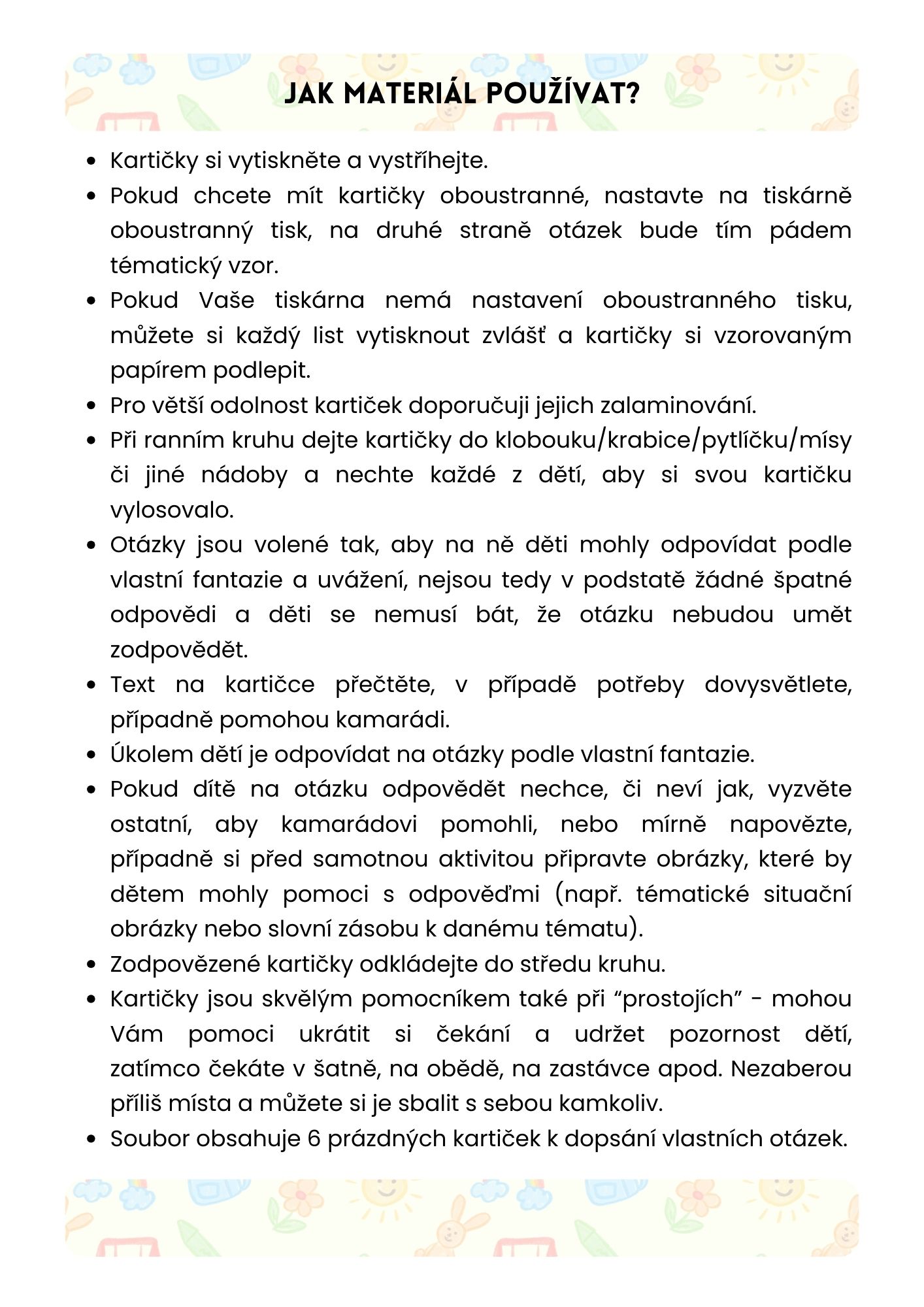 Kartičky si vytiskněte, vystříhejte a pro oboustranný efekt zvolte oboustranný tisk nebo použijte vzorovaný papír k podložení (je součástí souboru). Pro větší odolnost doporučuji kartičky zalaminovat. Při komunitním kruhu je vložte do nádoby a nechte děti, aby si každý vylosoval svou. Pokud dítě neví, jak odpovědět, pomozte mu nebo si předem připravte tématické obrázky jako podporu. Kartičky můžete využít i při čekání – jsou skladné a děti zabaví kdekoliv.