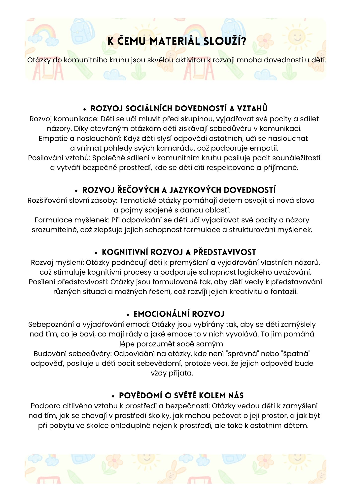 Otázky do komunitního kruhu v MŠ pomáhají dětem rozvíjet sociální dovednosti, empatii, komunikaci a sebevědomí. Přispívají k rozšiřování slovní zásoby, stimulují představivost a podporují logické myšlení. Navíc děti vedou k sebepoznání a vnímání světa kolem nich, čímž posilují vztah k prostředí a základní povědomí o sezónních a dalších změnách. Kartičky s otázkami tak nabízí hravou formu vzdělávání, která dětem pomáhá růst v mnoha oblastech.