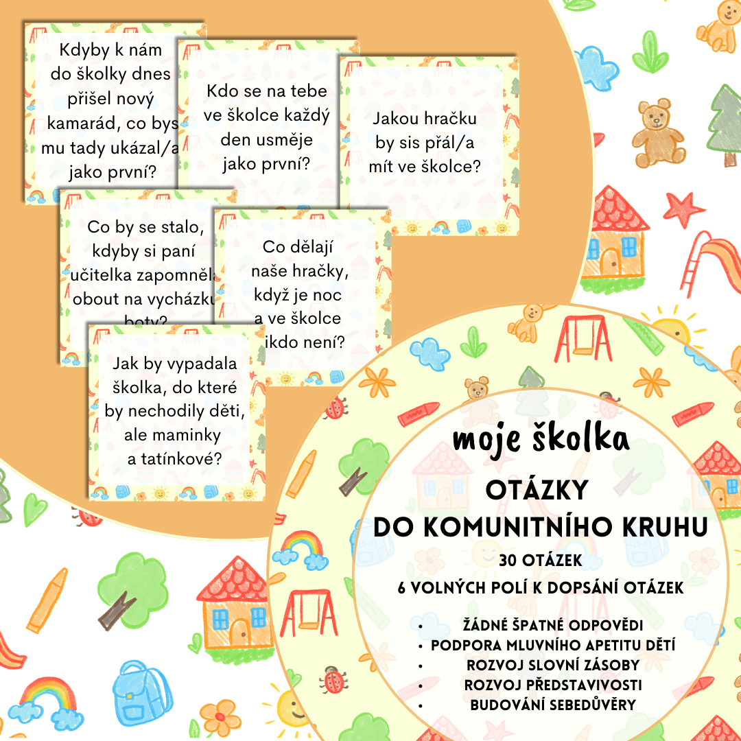 Soubor obsahuje 30 otázek do komunitního kruhu na téma MOJE ŠKOLKA a 6 volných kartiček pro dopsání vlastních otázek. Otázky jsou formulovány tak, aby děti mohly odpovídat svobodně, bez obav z chybných odpovědí.