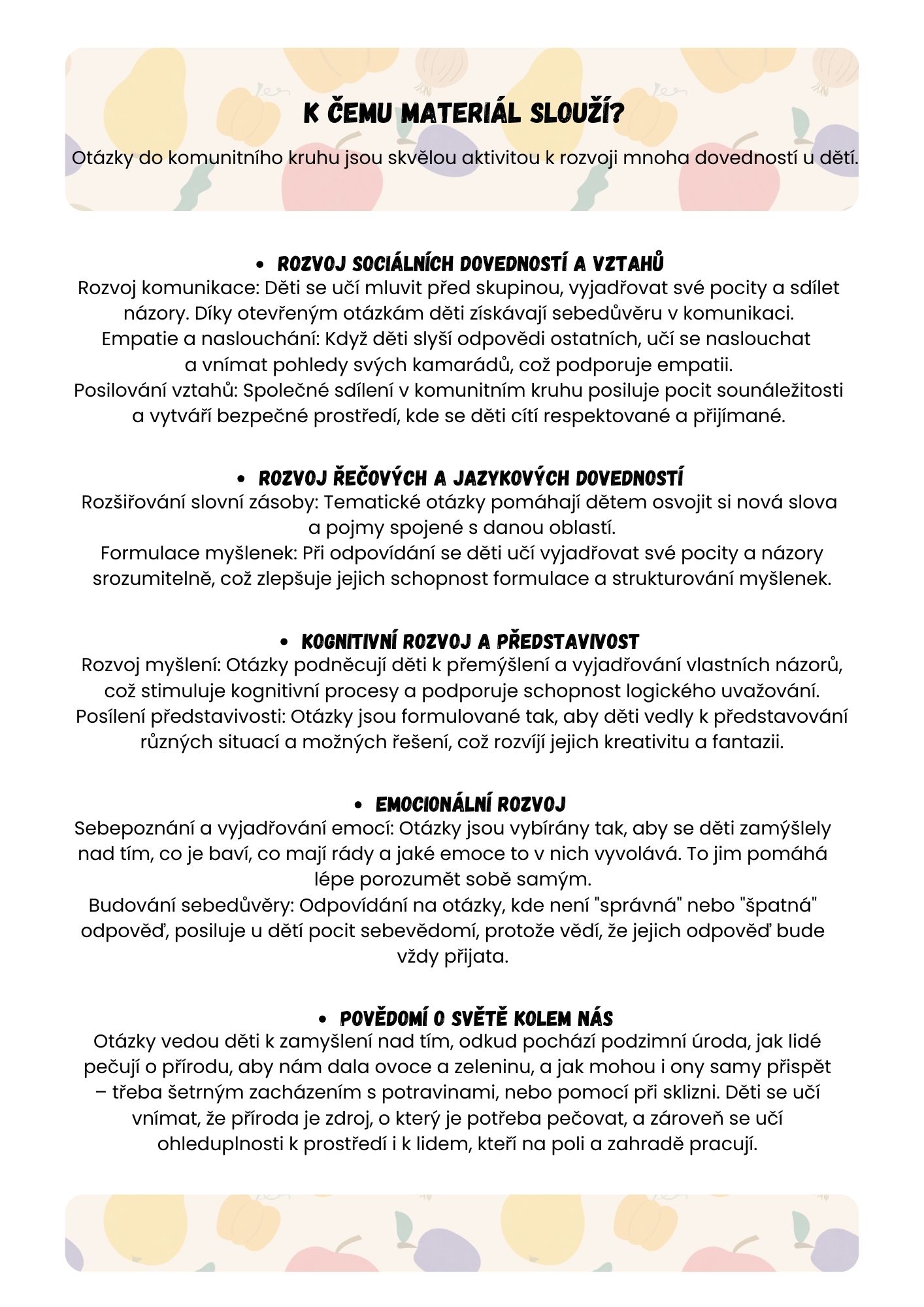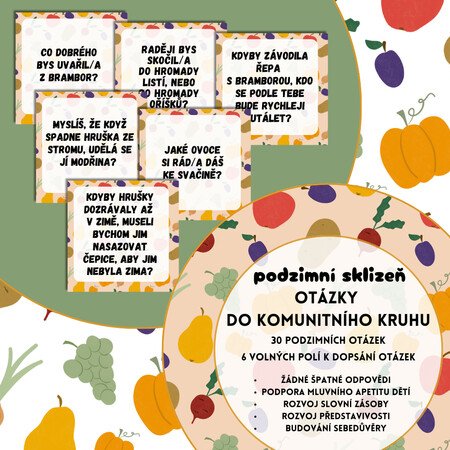 Soubor obsahuje 30 otázek do komunitního kruhu na téma PODZIMNÍ SKLIZEŇ (podzimní ovoce a zelenina) a 6 volných kartiček pro dopsání vlastních otázek. Otázky jsou formulovány tak, aby děti mohly odpovídat svobodně, bez obav z chybných odpovědí.