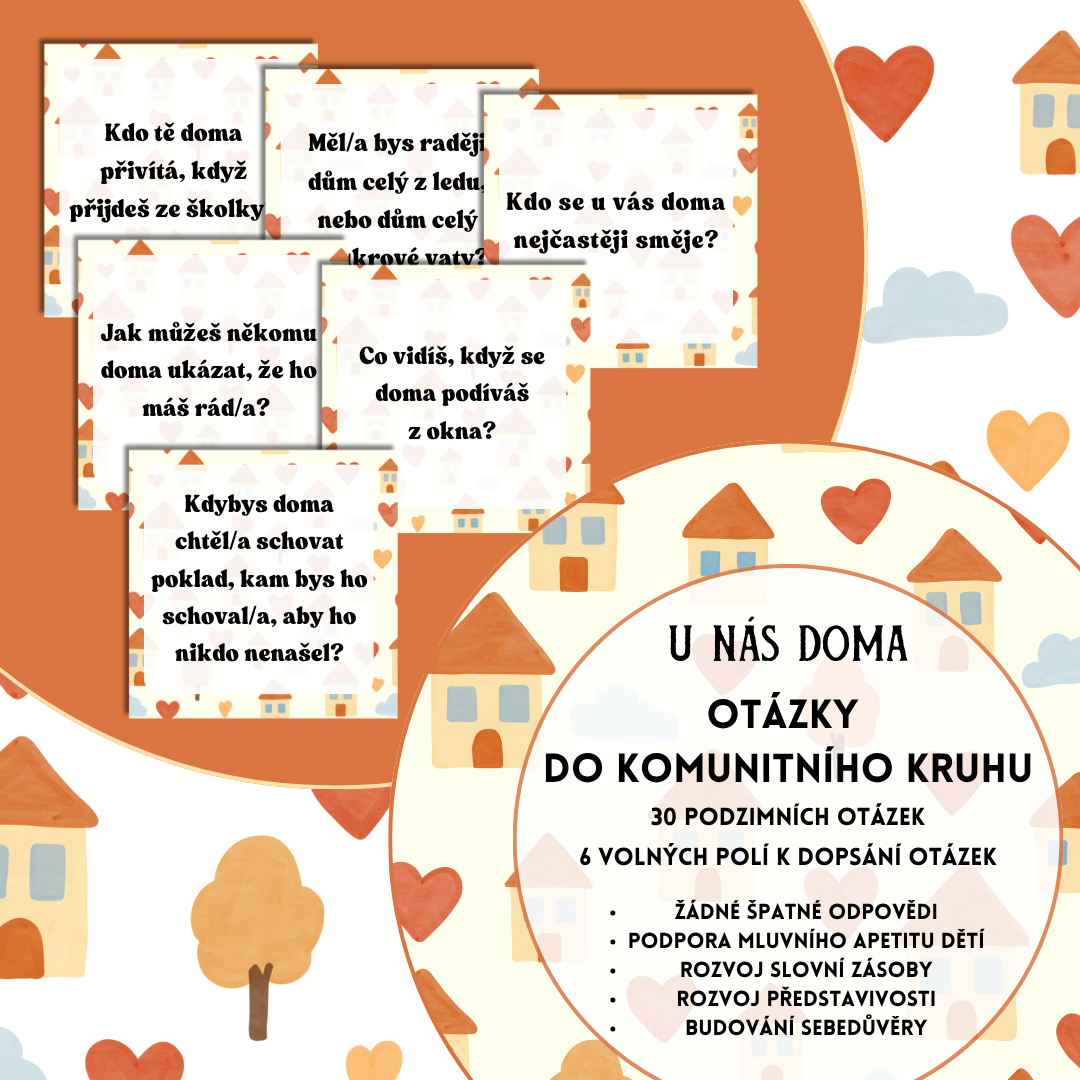 Soubor obsahuje 30 otázek do komunitního kruhu na téma U NÁS DOMA a 6 volných kartiček pro dopsání vlastních otázek. Otázky jsou formulovány tak, aby děti mohly odpovídat svobodně, bez obav z chybných odpovědí.