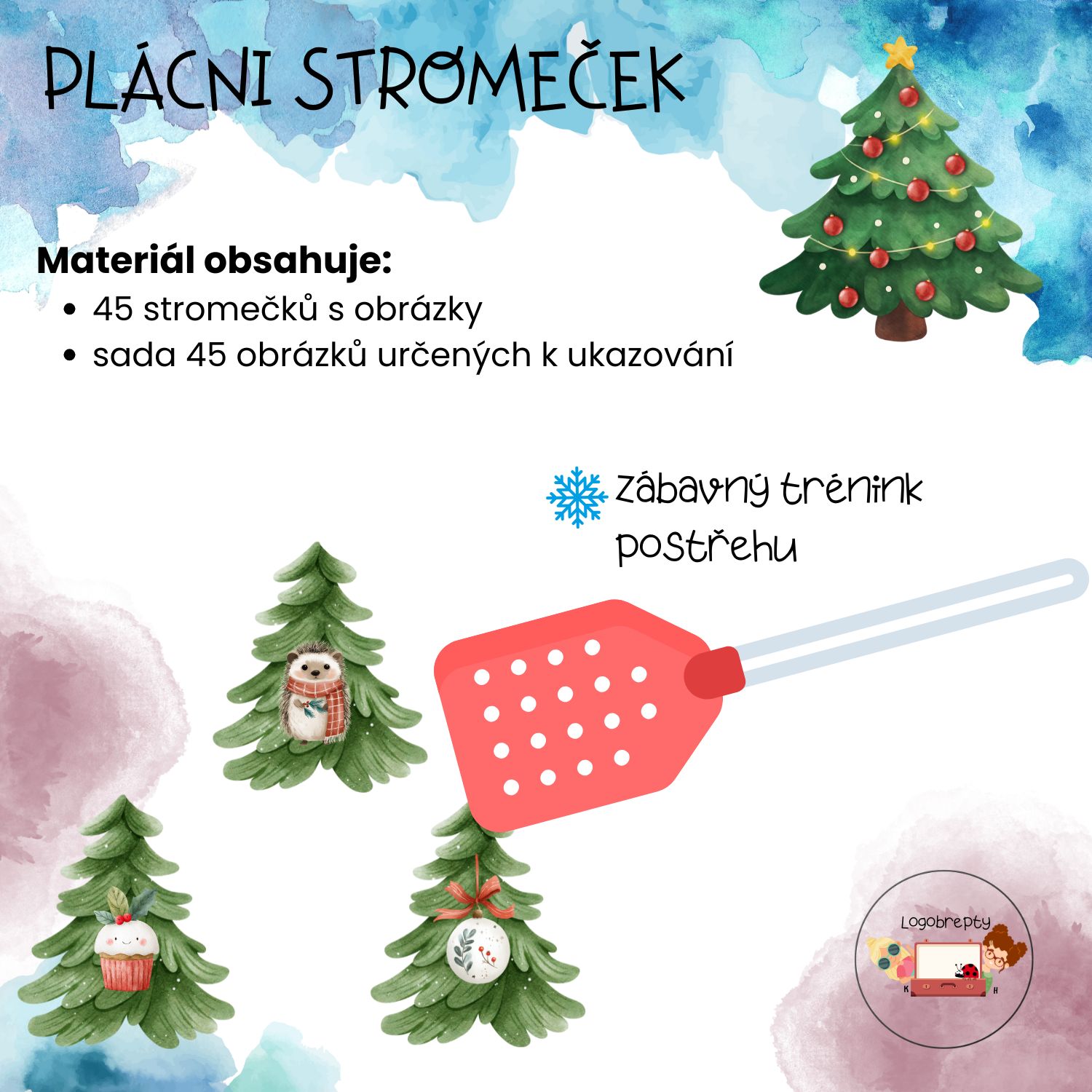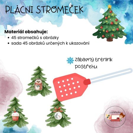 Zábavná a svižná aktivita, která rozhýbe celou třídu. Sada obsahuje 45 vánočních stromečků s obrázky a 45 samostatných obrázků k přiřazování. Na zem rozložíte část kartiček, děti si vezmou plácačky a čekají na vyvolané slovo nebo ukázaný obrázek. Jakmile zazní zadání, každý se snaží být první, kdo najde a „plácne“ správnou kartičku. Rychlost rozhoduje – kdo je první, bere bod.