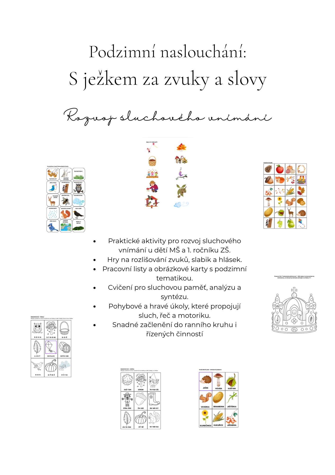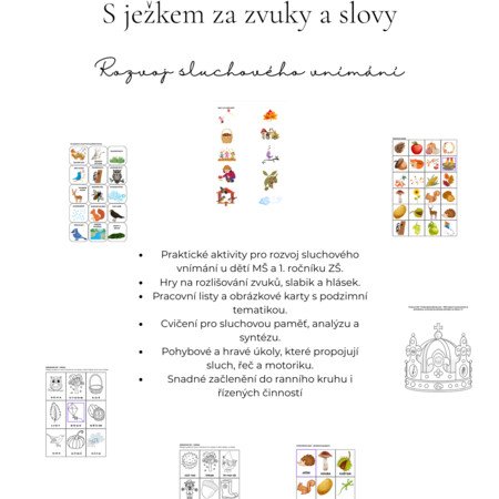 Najdete v něm hry na rozlišování zvuků, slabik i hlásek, podzimně laděné pracovní listy i pohybové úkoly, které propojují sluch, řeč a pohyb.
