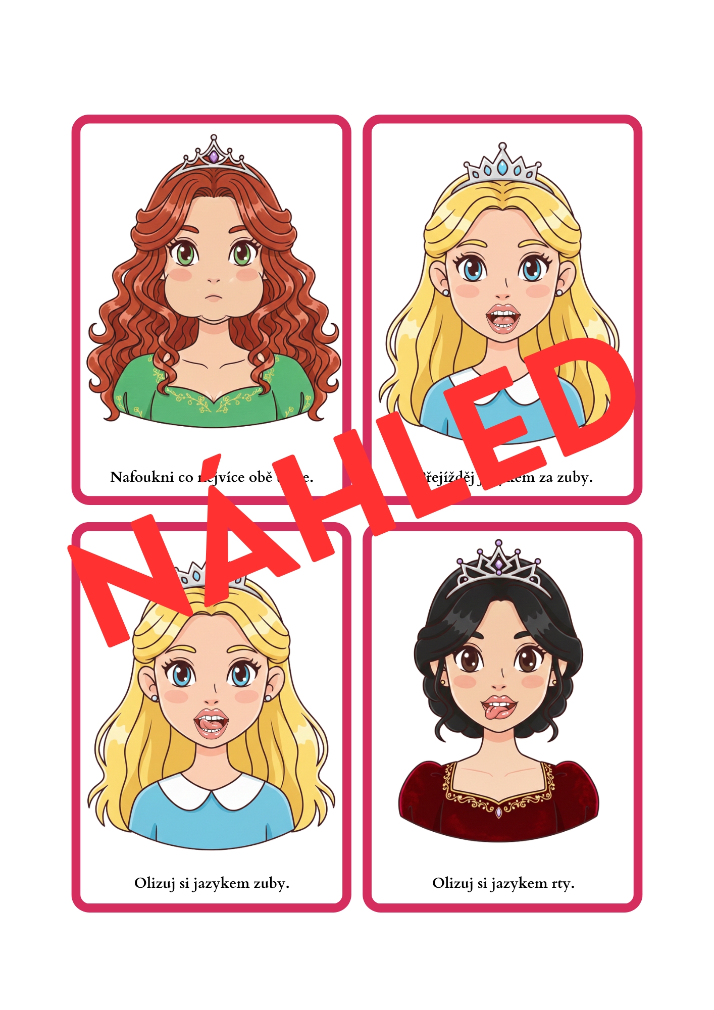 Na obrázcích je vždy vyobrazena princezna, která předvádí jednoduché oromotorické cvičení. Každá kartička obsahuje i jednoduchý popisek.
