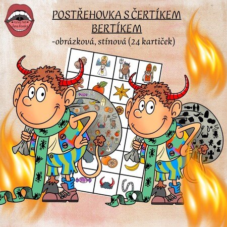 Soubor obsahuje velkého čerta o velikosti 4xA4 (stínový, obrázkový), kterého si vytiskneme, zalaminujeme, vystřihneme a spojíme izolepou ze zadní části. Dále je zde 25 kartiček s obrázky na téma MIKULÁŠ. Taháme obrázky z pytlíčku a úkolem je rychle najít daný obrázek. Kdo ho dříve najde, nechá si kartičku. Vyhrává ten, kdo má nejvíce kartiček.