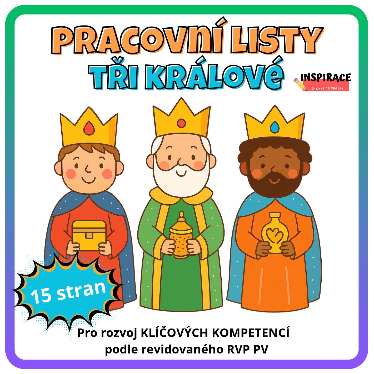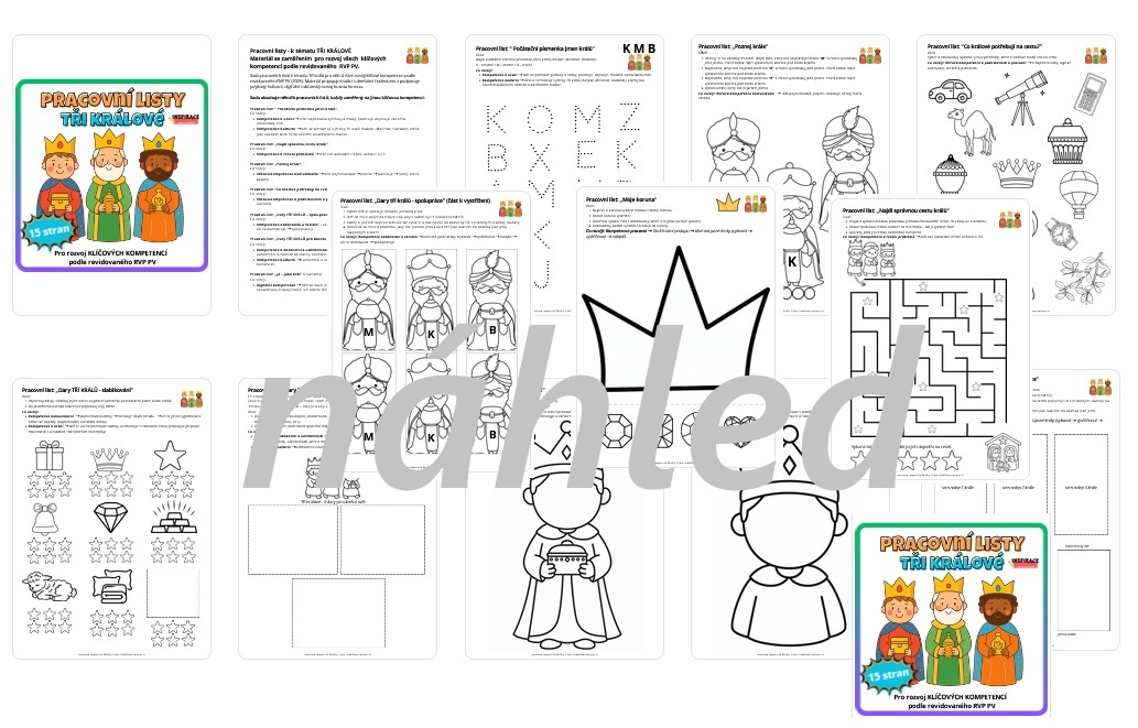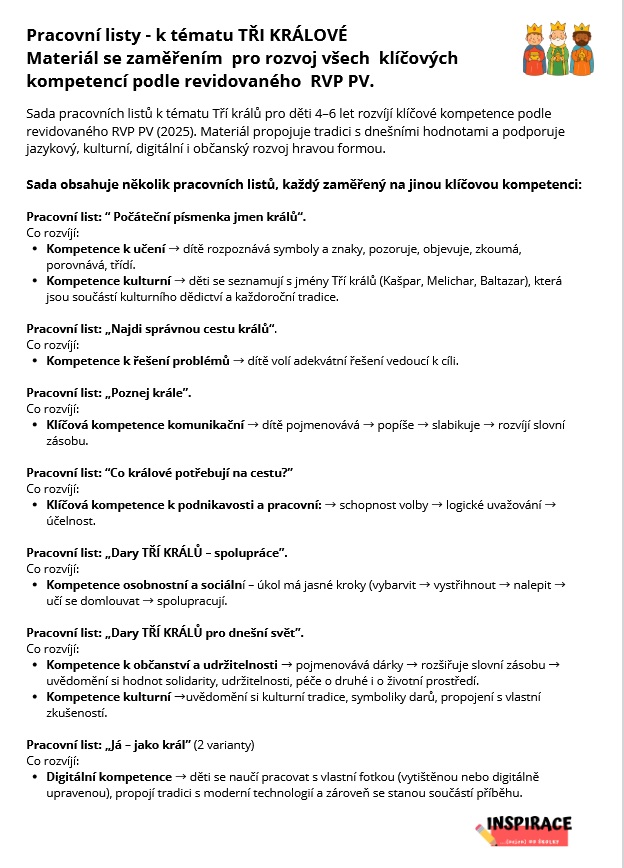 Sada pracovních listů k tématu Tří králů pro děti 4–6 let rozvíjí klíčové kompetence podle revidovaného RVP PV (2025). Materiál propojuje tradici s dnešními hodnotami a podporuje jazykový, kulturní, digitální i občanský rozvoj hravou formou.