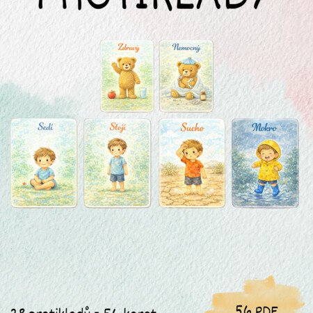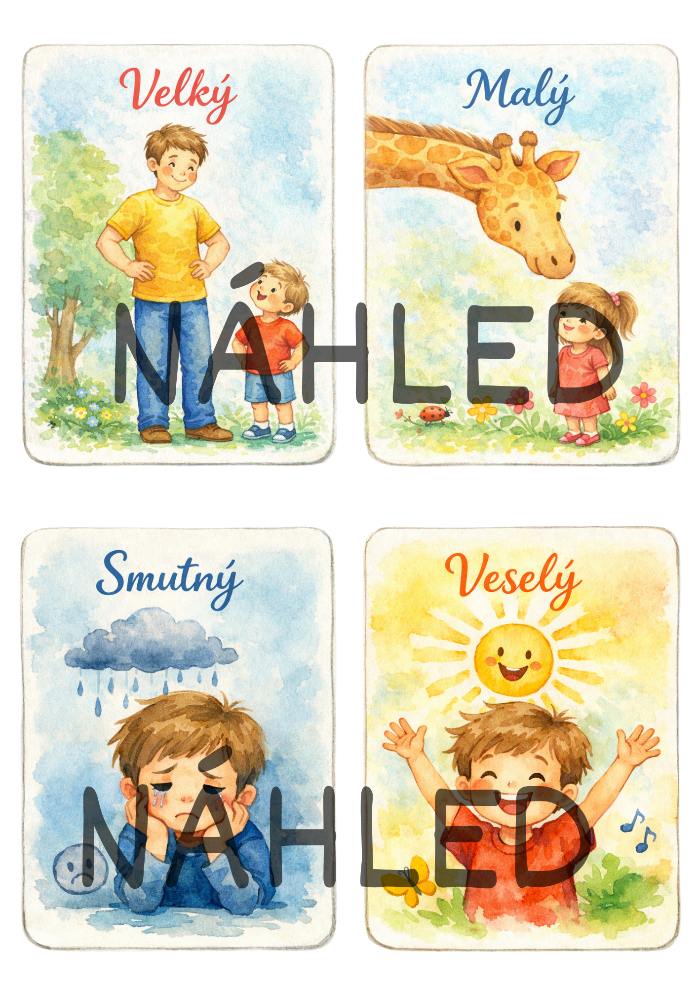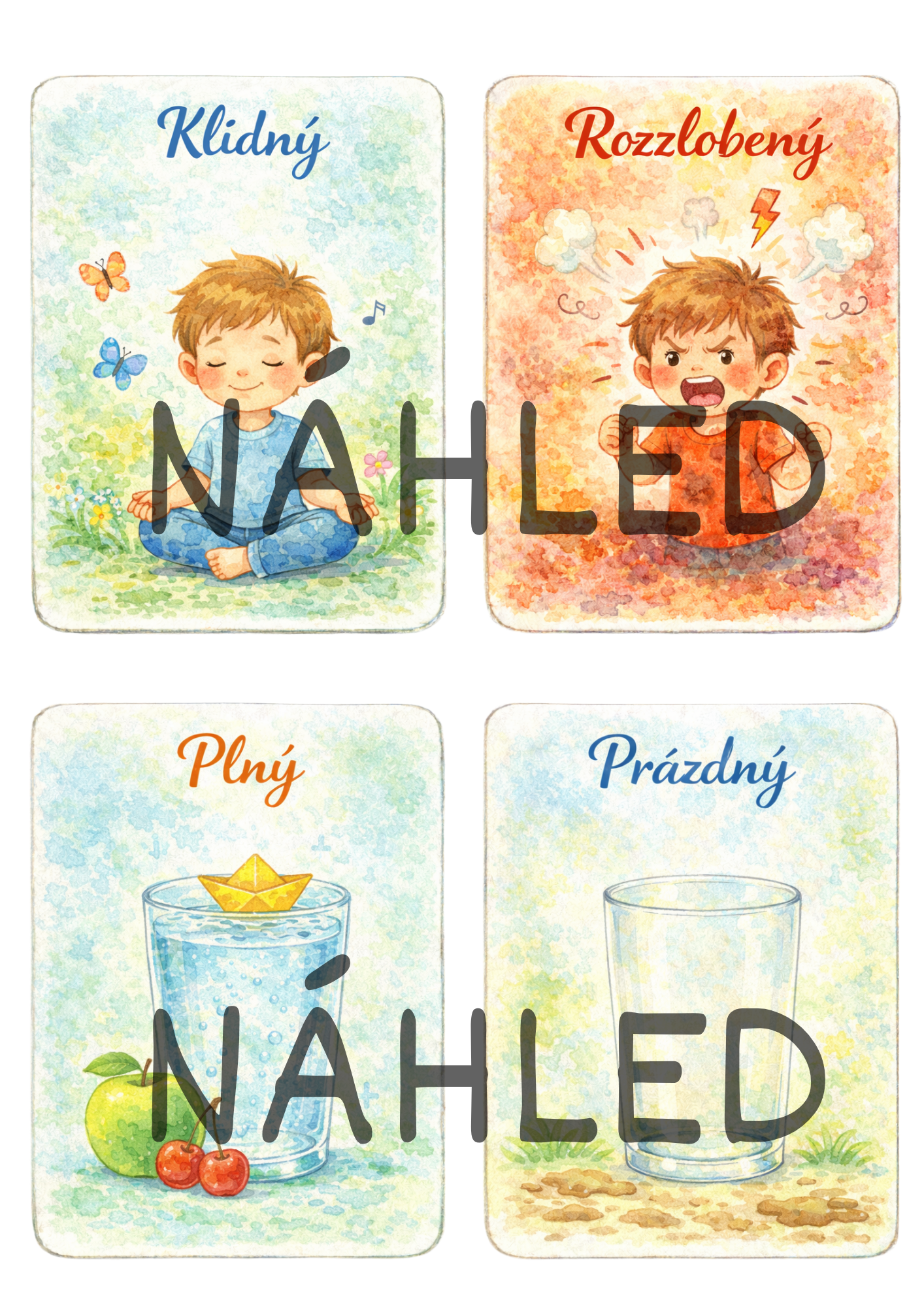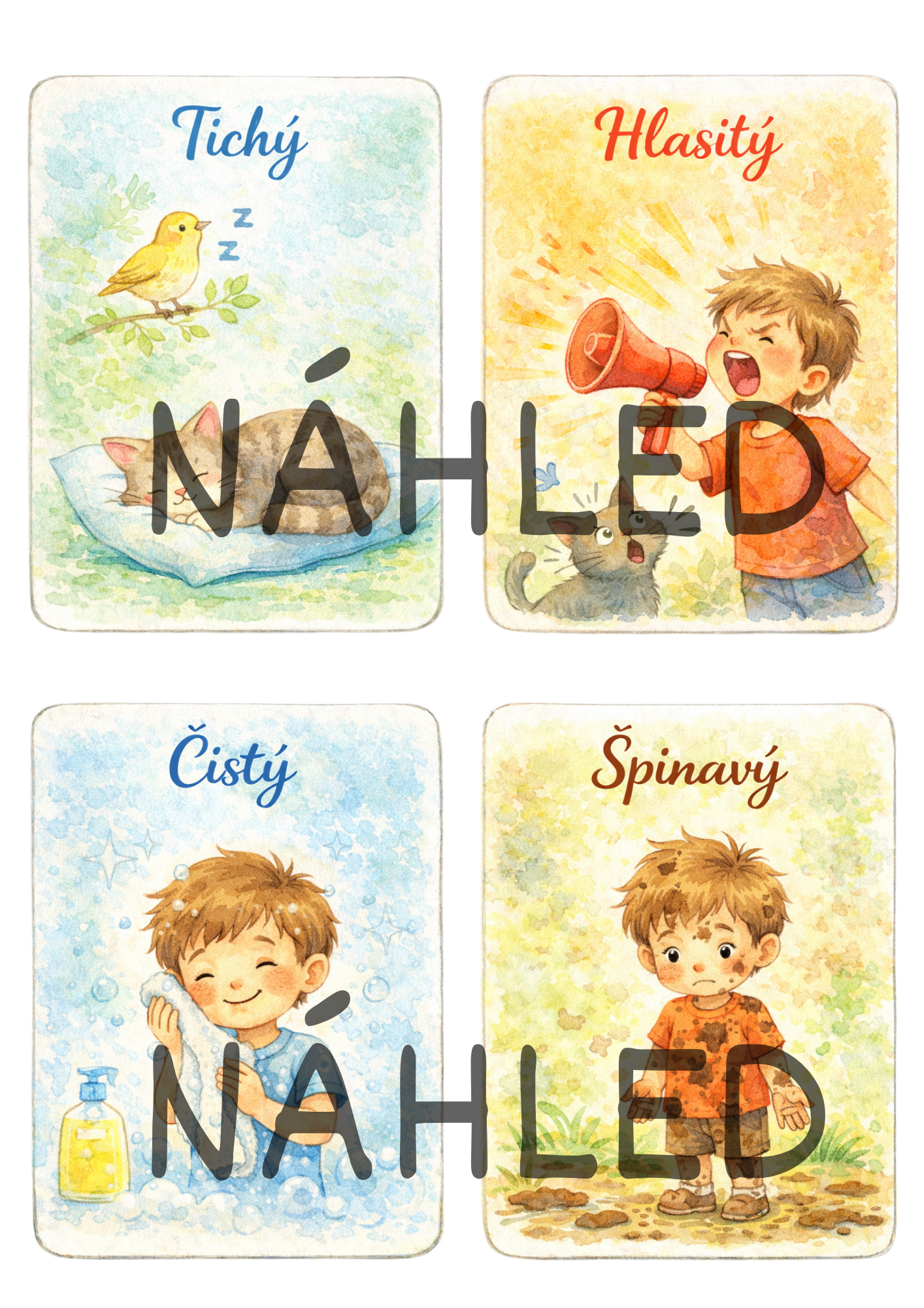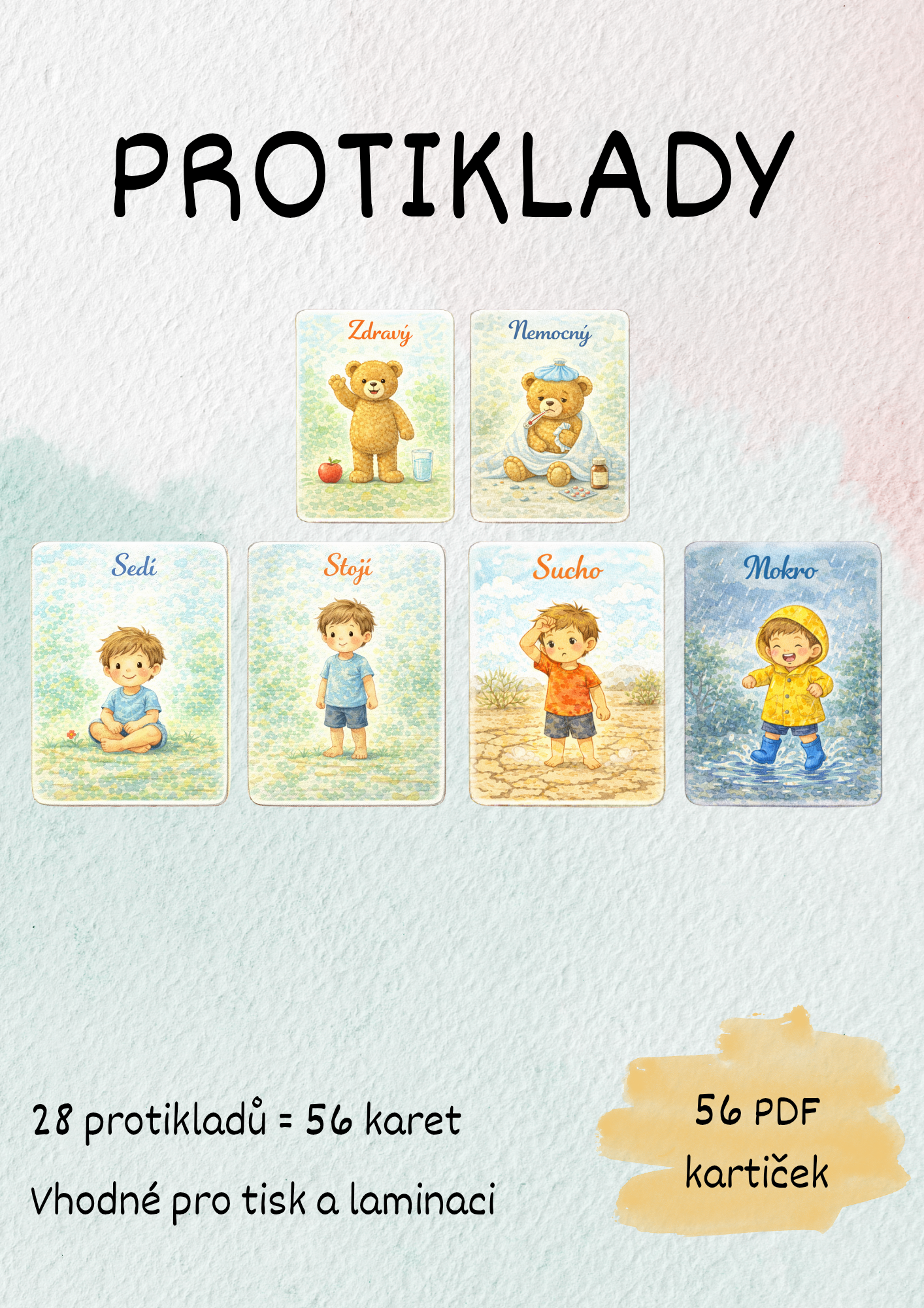 Didaktická pomůcka slouží k rozvoji slovní zásoby a porozumění významu protikladů pomocí názorných ilustrací.
