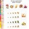 deštník, drak, hříbky, muchomůrka červená, gumáky, kaštany, podzimní strom, listy, podzimní věneček, polévka, šála s lístečky, Dušičky (vyobrazené svíčky), koloušek, jablko, dýně, teplý nápoj (dvě různá vyobrazení), prší (kapky vody), kočička a pejsek