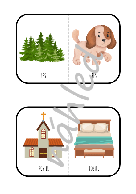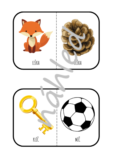 Materiál obsahuje 32 dvojic rýmujících se obrázků a 34 dvojic kartiček určených ke kolíčkování, případně je lze použít jako brožuru a obrázky jednoduše zakroužkovat. Součástí souboru je také několik aktivit zaměřených na práci s rýmy.