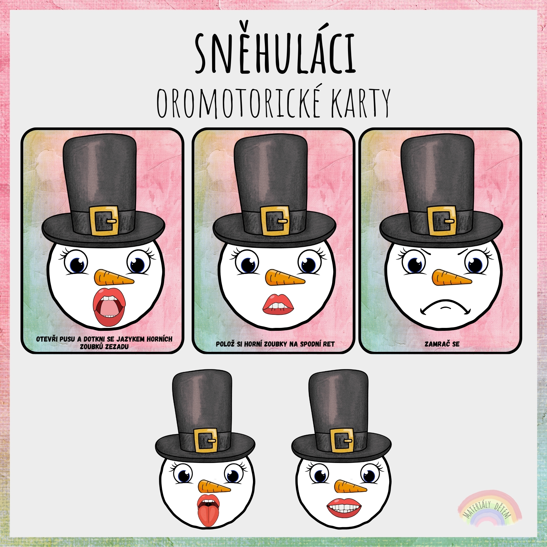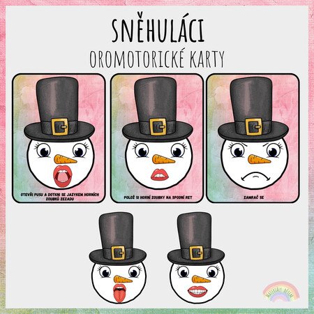 Soubor obsahuje 10 oromotorických karet na téma Sněhuláci. Každá kartička znázorňuje a popisuje jednoduchý cvik k procvičení motoriky mluvidel.