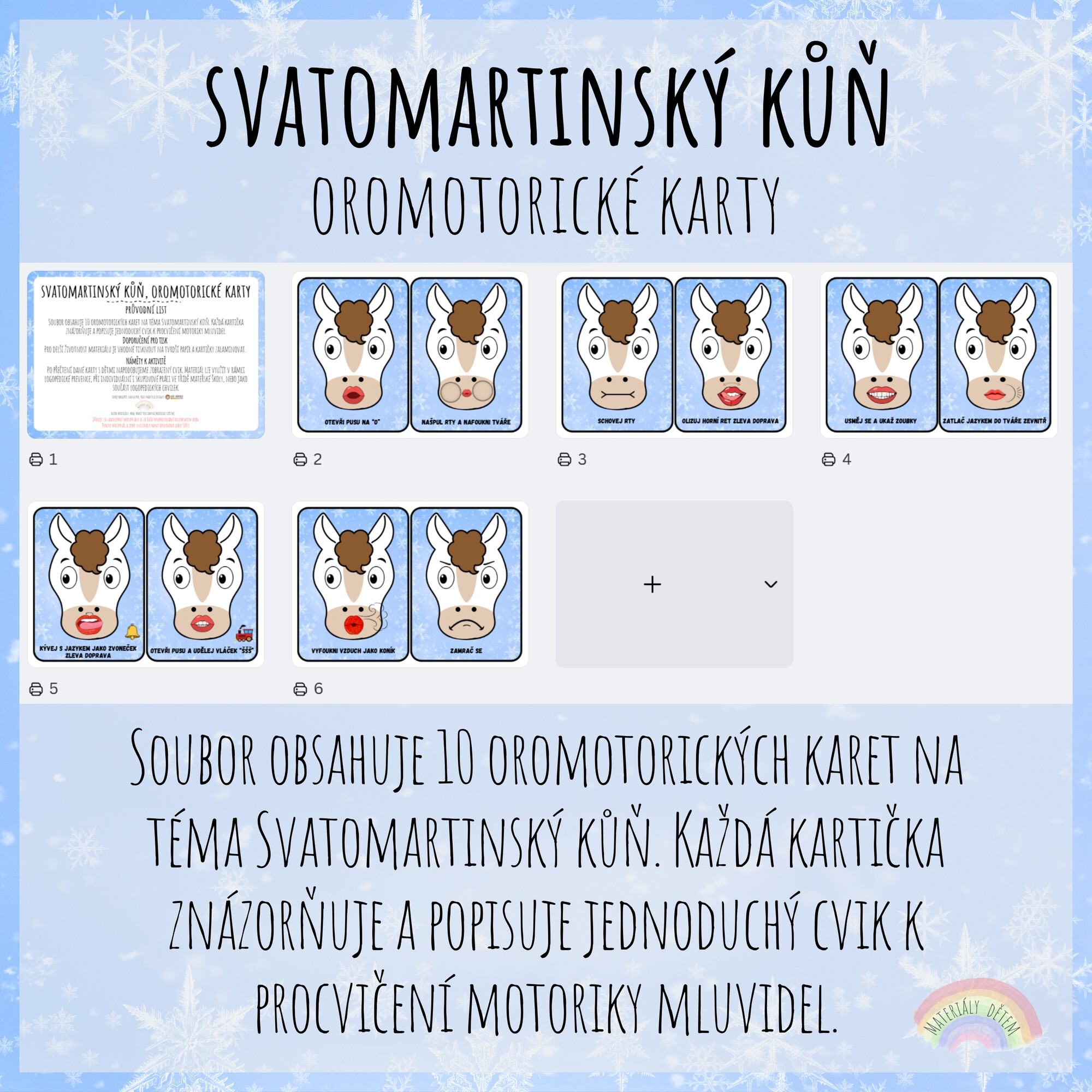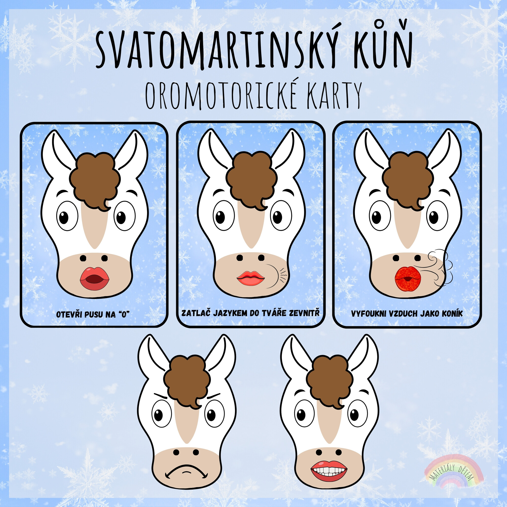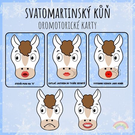 Soubor obsahuje 10 oromotorických karet na téma Svatomartinský kůň. Každá kartička znázorňuje a popisuje jednoduchý cvik k procvičení motoriky mluvidel.