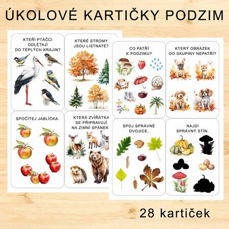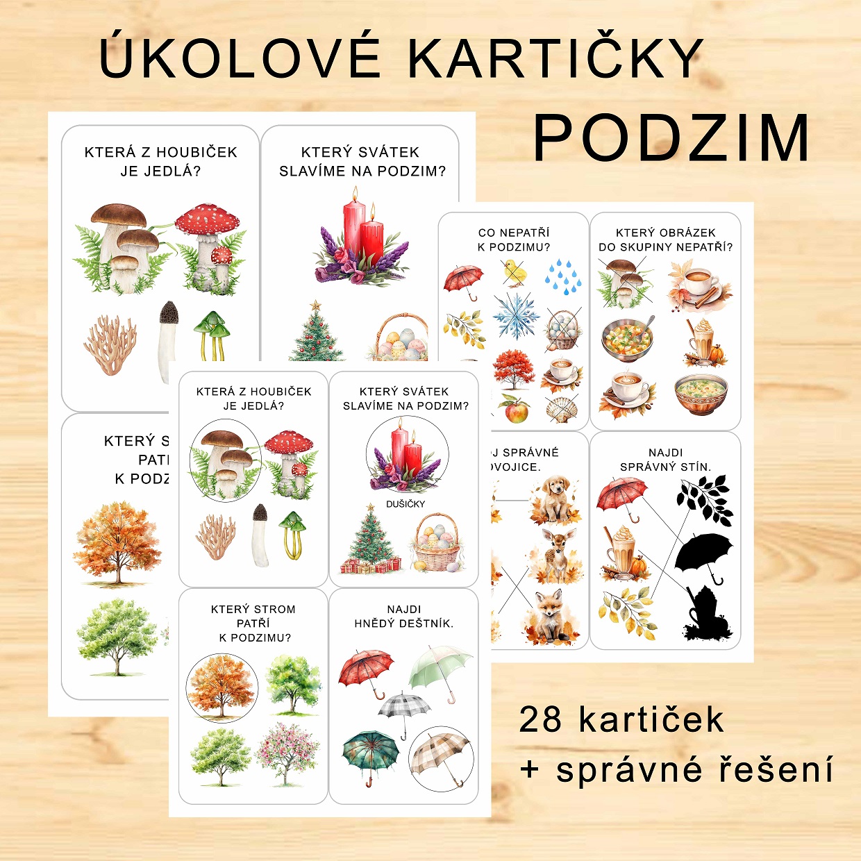 Kartičky můžete využít při probírání témat jako jsou podzim, les, houby v lese, jedlé a jedovaté houbičky, listy, listnaté a jehličnaté stromy, plody stromů, kaštan, tvoření z kaštanů, sběr, plody lesa, mykologie, mykolog, příroda v lese, ptáci, čáp, vlaštovka, medvěd, liška, ježek, deštník, počasí, Dušičky, zimní spánek, ...