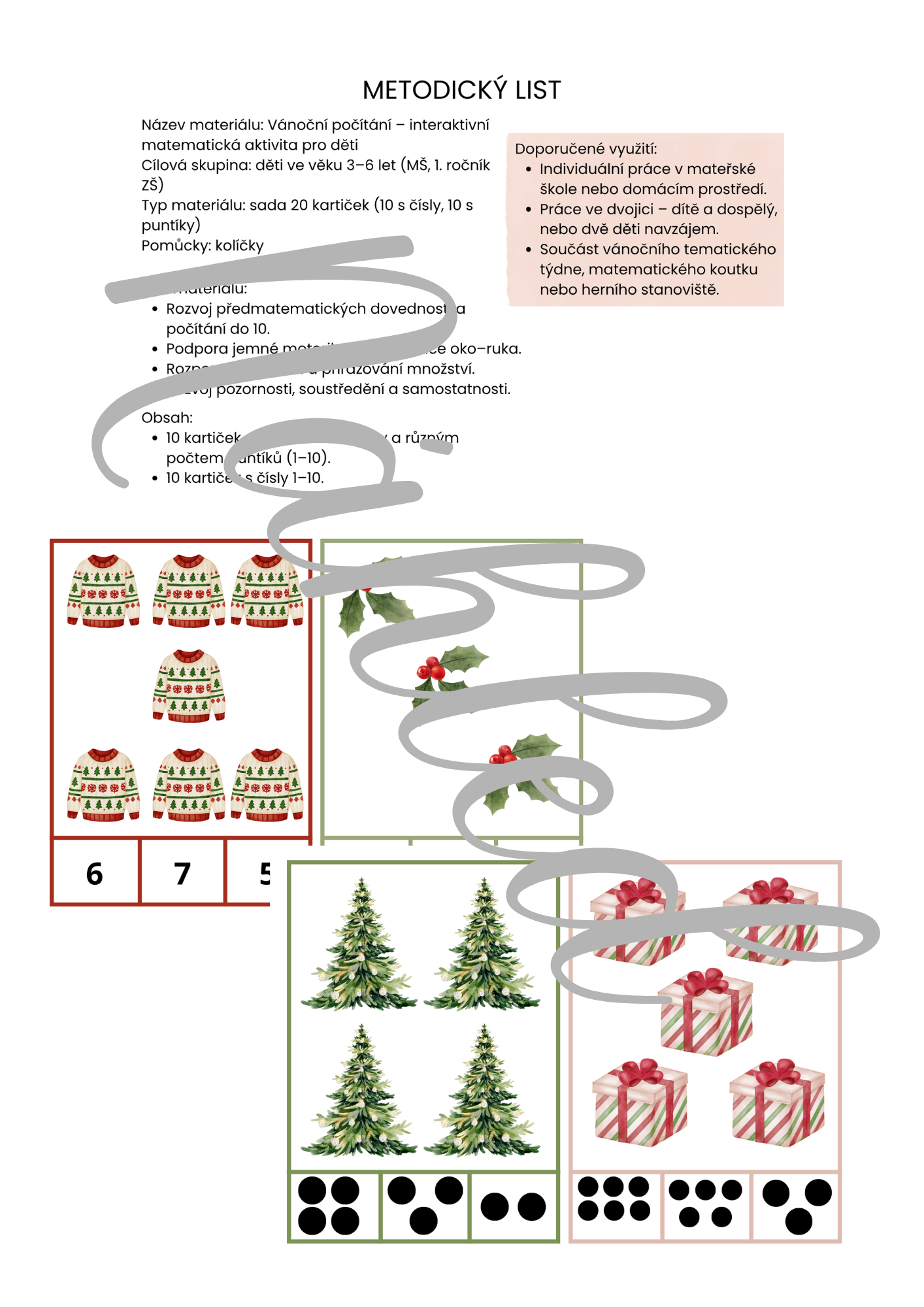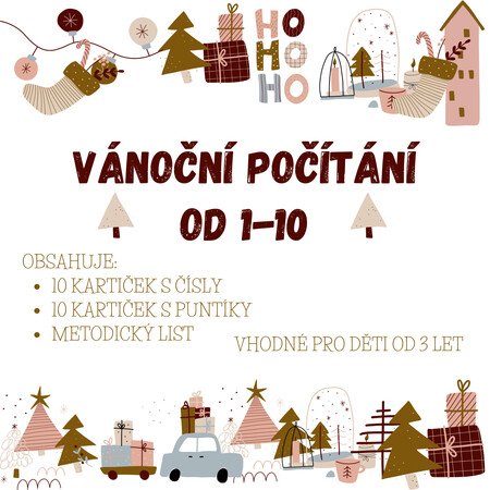 Vánoce nejsou jen o dárkách – jsou i o radosti z objevování. Vánoční počítání je interaktivní sada kartiček, která dětem pomáhá procvičit počítání do 10 zábavnou formou. Pomocí kolíčků děti připínají čísla ke správnému počtu puntíků – a přitom si ani nevšimnou, že se učí.