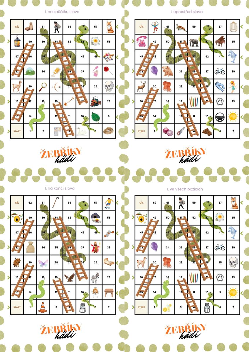Hra obsahuje 4 různá herní pole, která jsou zaměřená na procvičování hlásky L v různých pozicích ve slově (začátek, střed, konec). Při každém zastavení na obrázku dítě pojmenuje slovo nahlas, čímž dochází k přirozenému opakování hlásky v řeči.