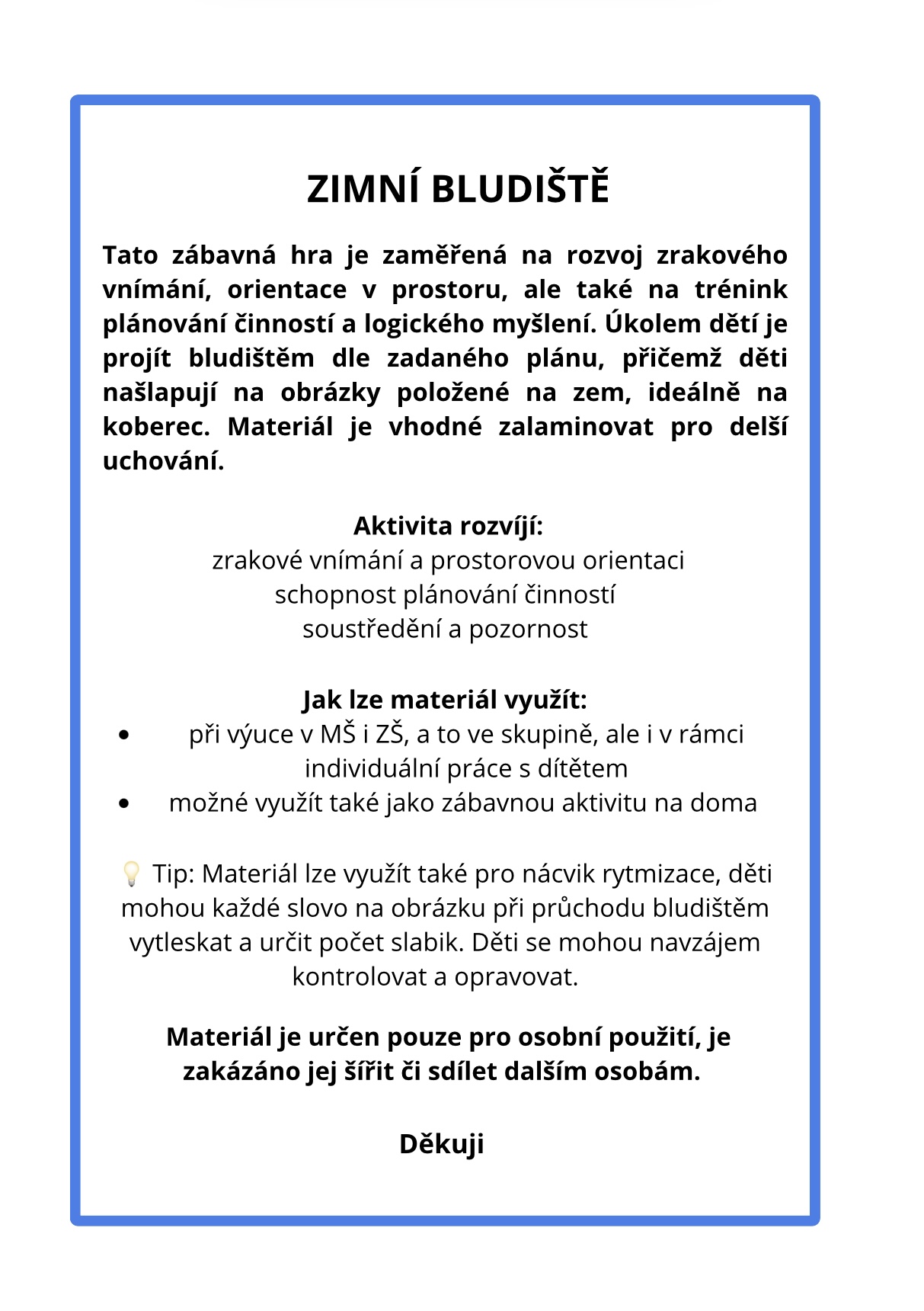 Tato zábavná hra je zaměřená na rozvoj zrakového vnímání, orientace v prostoru, ale také na trénink plánování činností a logického myšlení. Úkolem dětí je projít bludištěm dle zadaného plánu, přičemž děti našlapují na obrázky položené na zem, ideálně na koberec. Materiál je vhodné zalaminovat pro delší uchování.
