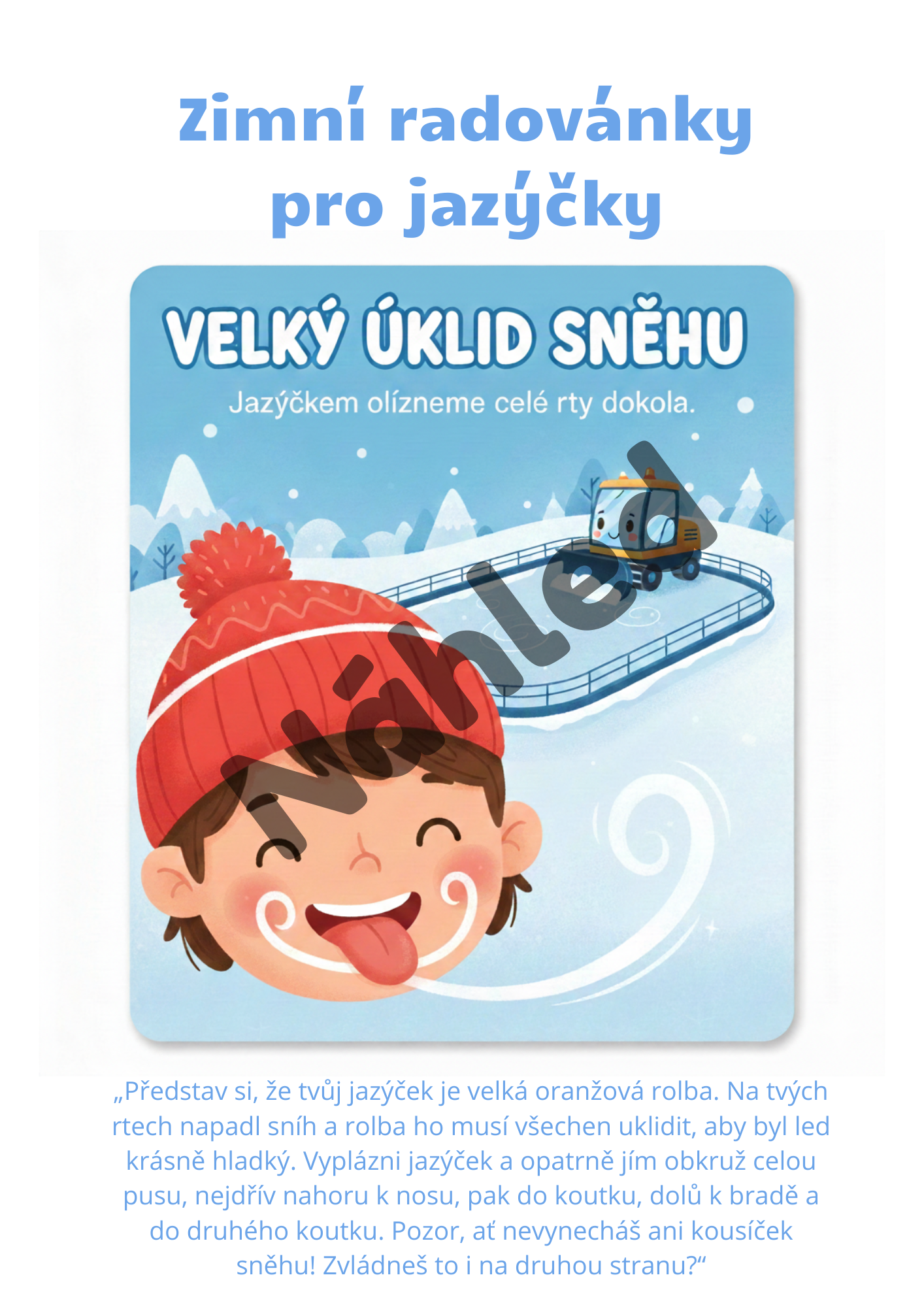 Materiál obsahuje obrázkové karty se zimními motivy (krasobruslení, lyžování, hokej, rolba, sáňkování aj.), které děti motivují k pohybu jazyka a ke správnému provedení cviků. Součástí jsou také metodické popisy pro pedagogy a jednoduché instrukce pro děti.