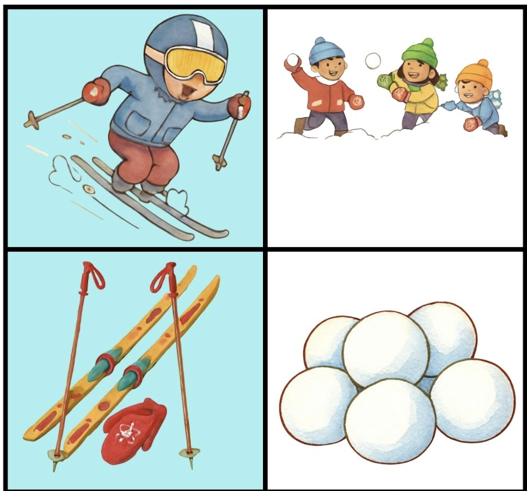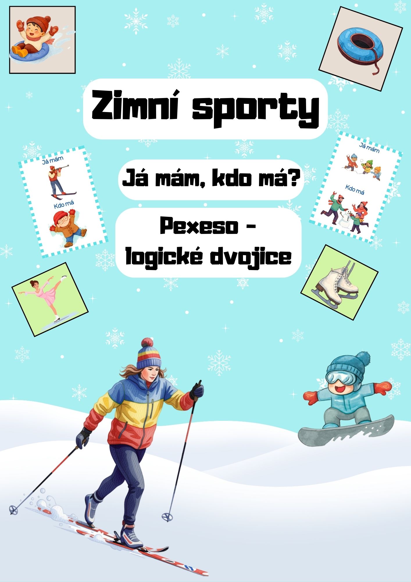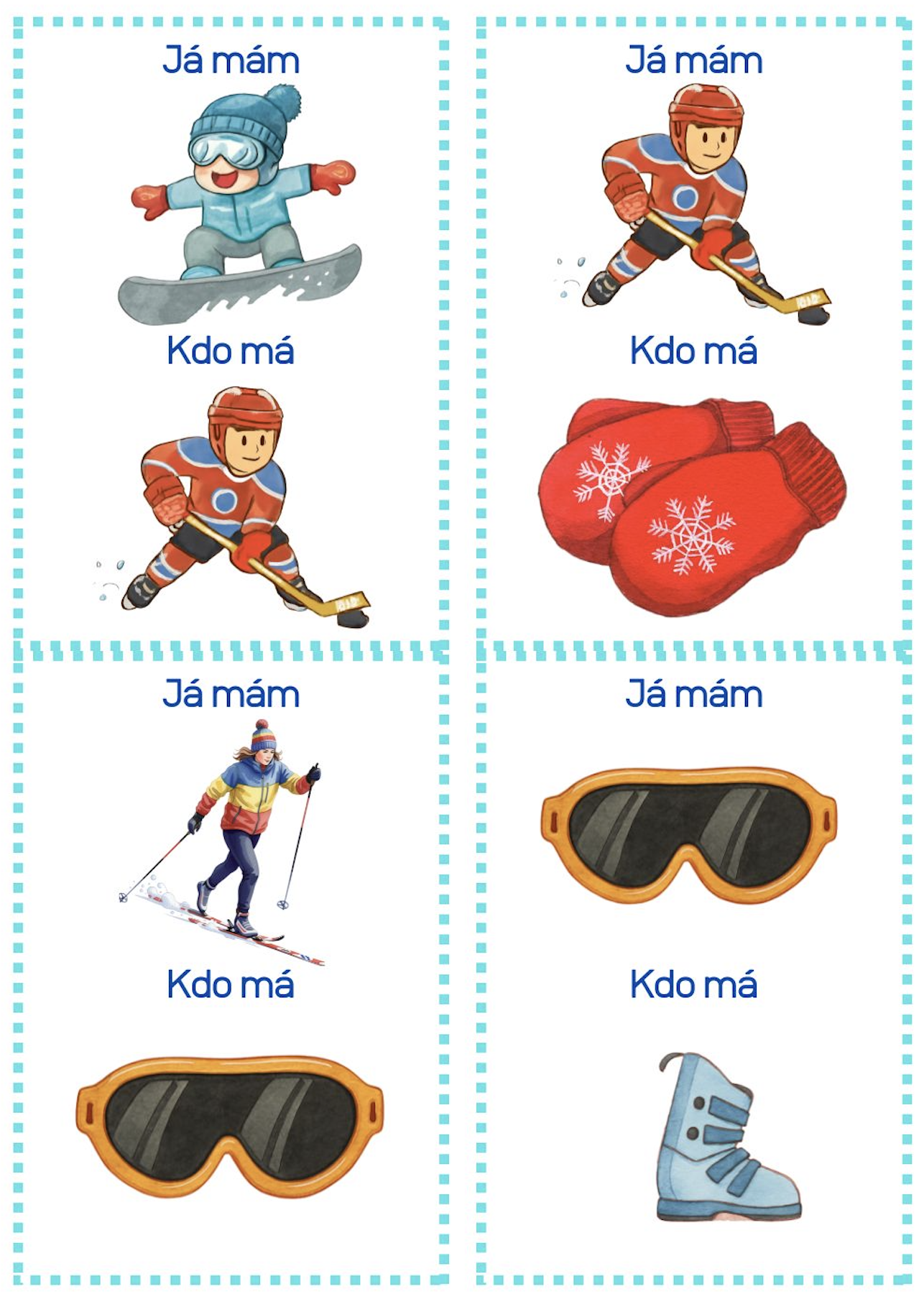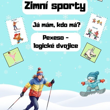 Soubor obsahuje 24 kartiček na hru Já mám, kdo má? s tématem zimních sportů. Hra je určena pro děti v mateřské škole a pro 1. třídy základních škol. Každý žák dostane minimálně jednu kartu, cílem hry je vytvořit řetěz na sebe navazujících karet.