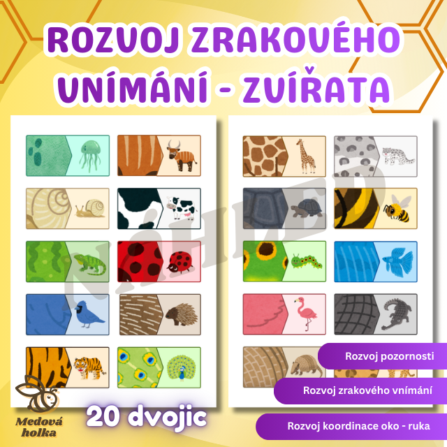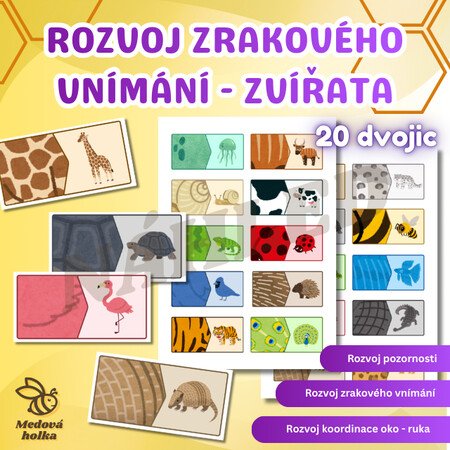 Materiál je zaměřen na rozvoj zrakového vnímání prostřednictvím přiřazování části (struktura srsti, peří či šupin) k celku (konkrétní zvíře). Děti pracují s vizuálním detailem, porovnávají barvy, vzory a struktury a hledají správné souvislosti.