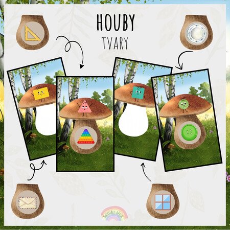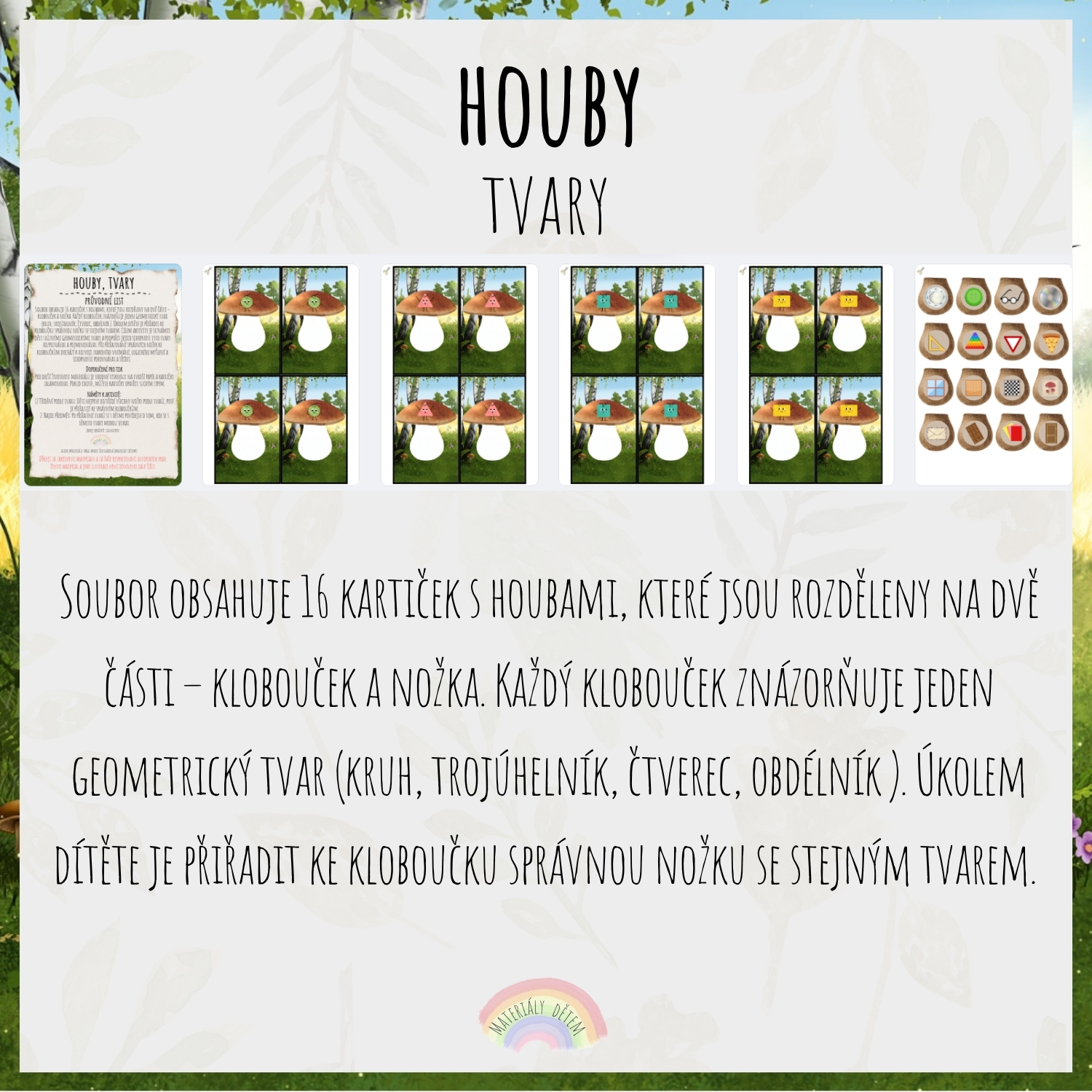 Soubor obsahuje 16 kartiček s houbami, které jsou rozděleny na dvě části – klobouček a nožka. Každý klobouček znázorňuje jeden geometrický tvar (kruh, trojúhelník, čtverec, obdélník ). Úkolem dítěte je přiřadit ke kloboučku správnou nožku se stejným tvarem. Cílem aktivity je seznámit děti s různými geometrickými tvary a podpořit jejich schopnost tyto tvary rozpoznávat a pojmenovávat. Při přiřazování správných nožek ke kloboučkům dochází k rozvoji zrakového vnímání, logického myšlení a schopnosti porovnávat a třídit.