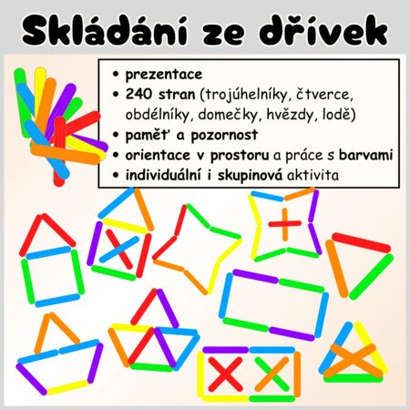 Prezentace obsahuje 240 obrázků ze dřívek rozdělených do 6 kategorií: trojúhelníky, čtverce, obdélníky, domečky, hvězdy a lodě.
