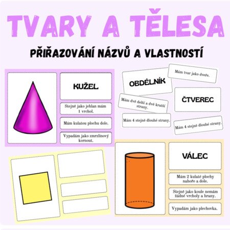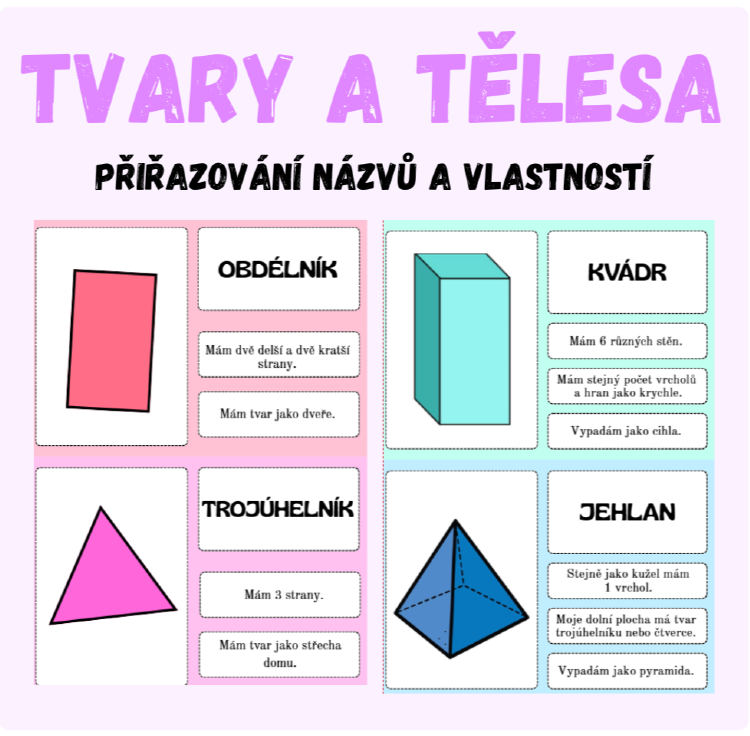 - Kartičky s názvy a popisy vlastností (počet stran, hran, vrcholů, podobnost předmětům z reálného života)