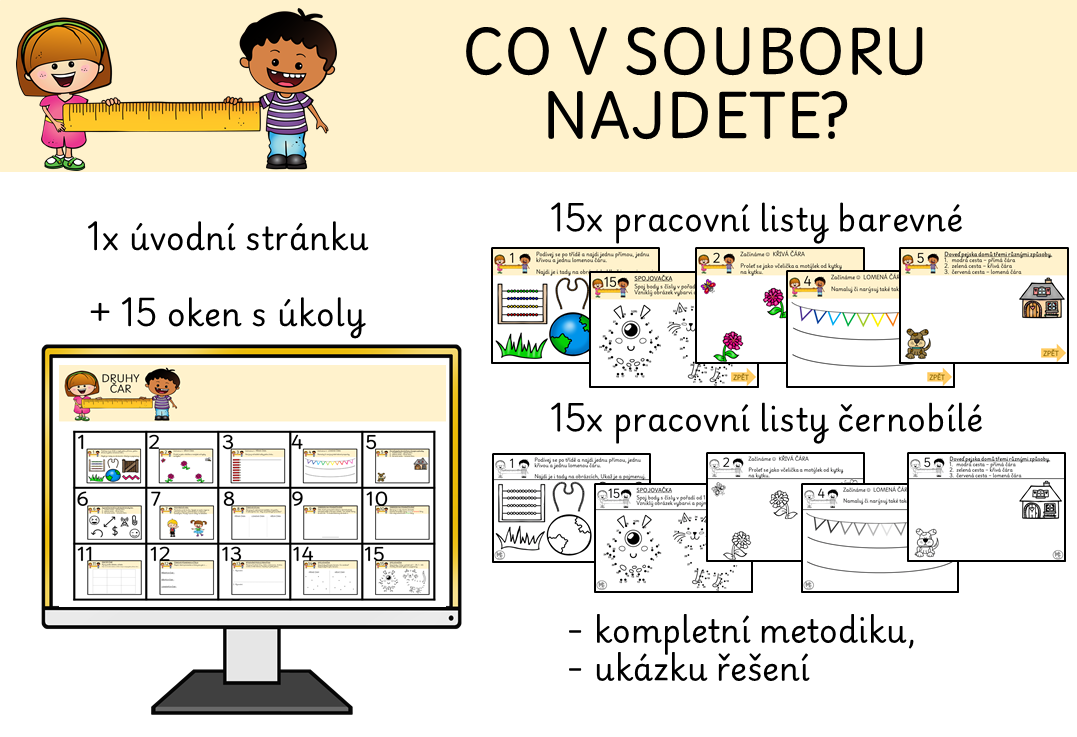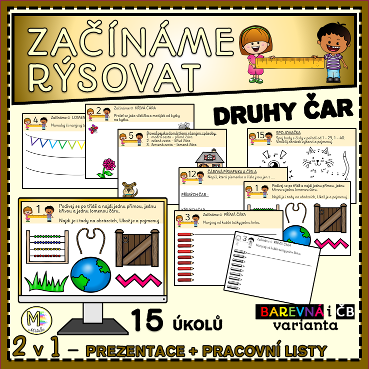 Tento dvojmateriál „Začínáme rýsovat – Druhy čar“ byl vytvořen tak, aby výuka základů geometrie byla pro děti srozumitelná, přehledná a zábavná – a zároveň naplňovala očekávané výstupy podle RVP.