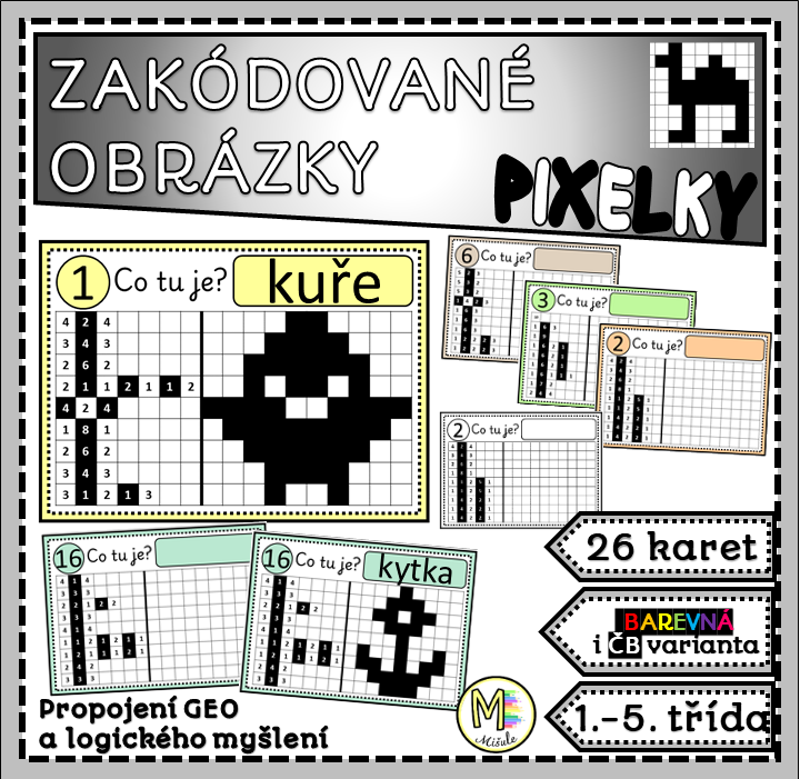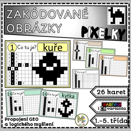 „Zakódované obrázky – Pixelky“ jsou souborem 26 pracovních karet formátu A5, které propojují geometrii, logické uvažování a princip kódování.