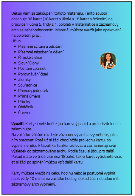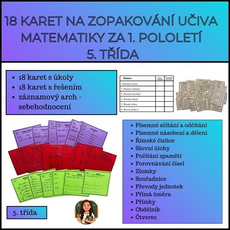 Tento soubor obsahuje 36 karet (18 karet s úkoly a 18 karet s řešením) na procvičení učiva 5. třídy z 1. pololetí v matematice a záznamový arch se sebehodnocením. Materiál můžete využít jako opakovaní na pololetní práci.