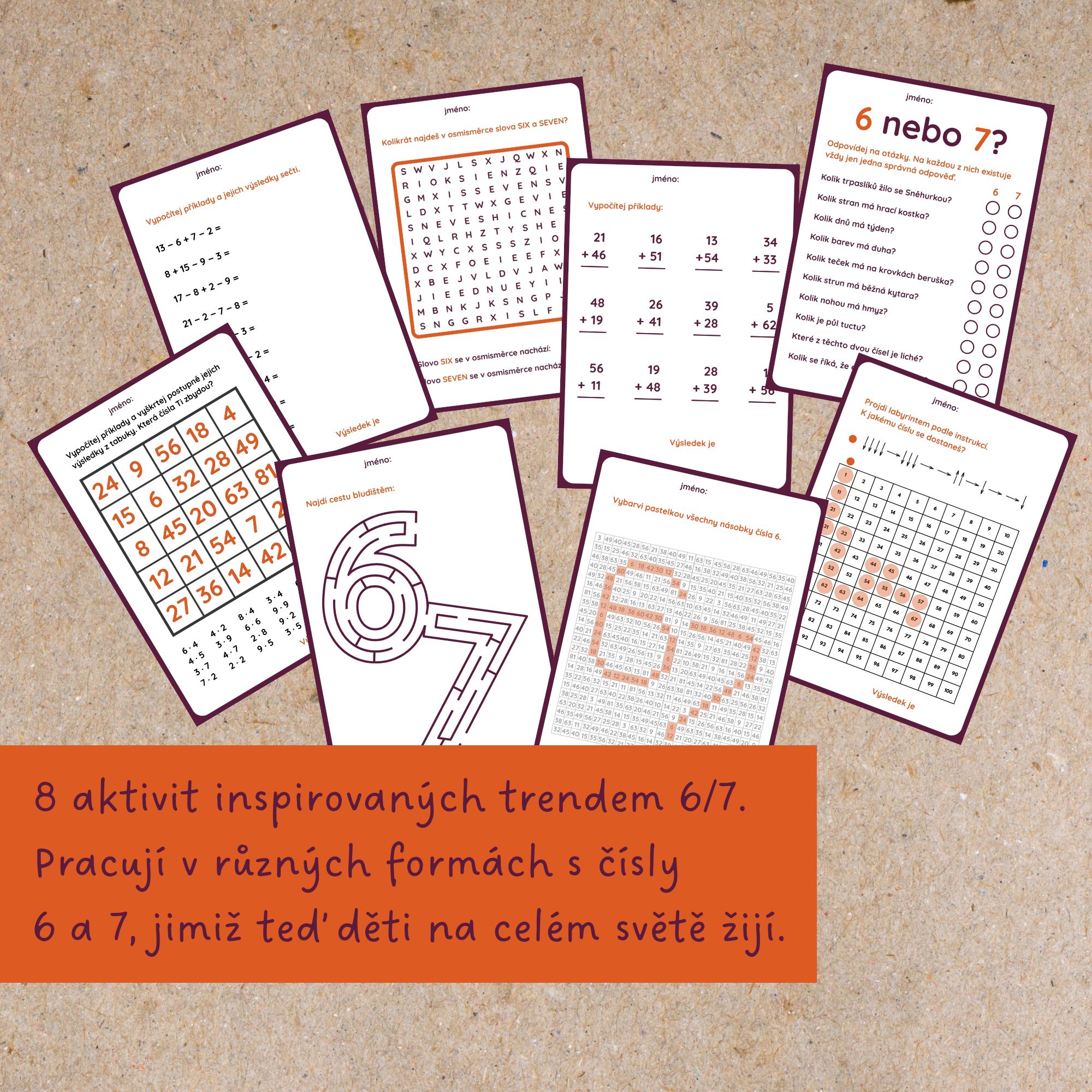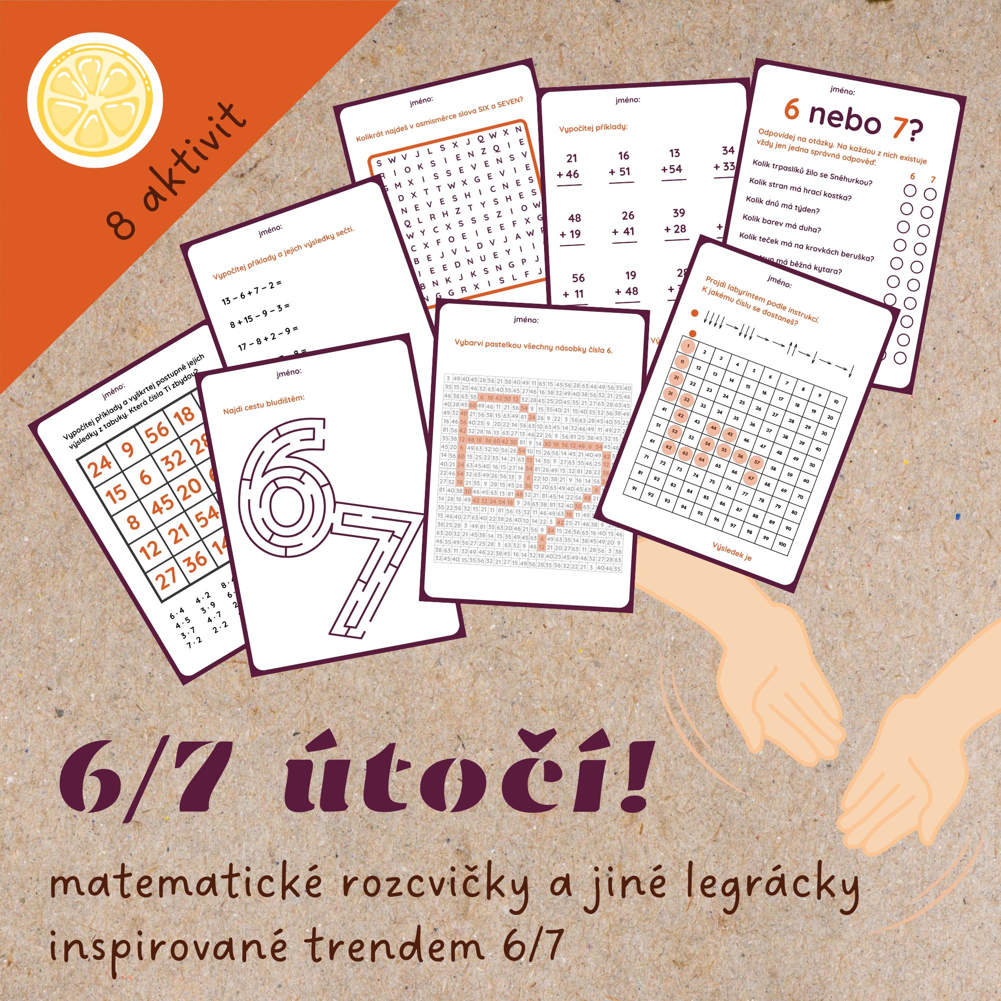 ⁶🤷⁷ Soubor obsahuje 8 aktivit inspirovaných trendem 6/7. Pět z nich jsou matematická cvičení, která můžete využít třeba jako zábavnou zahřívací rozcvičku na začátku hodiny. Děti při nich procvičí malou násobilku, sčítání a odčítání nebo orientaci v ploše. Výsledkem všech příkladů je vždy 67, což je překvapení, které děti čeká po správném výpočtu nebo rozluštění. Než na to ale přijdou, musí trochu potrápit mozkové závity. Tři zbylé aktivity jsou legrácky, které se budou hodit třeba dětem, které mají práci hotovou a je potřeba je na chvíli zabavit.