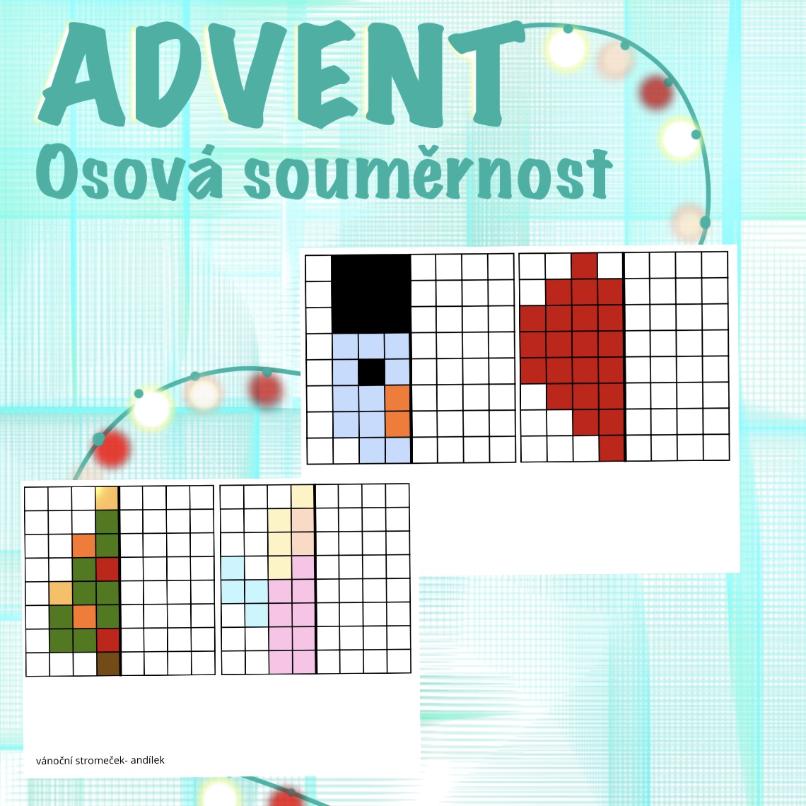 -Každý list zobrazuje půlený obrázek s vyznačenou osou souměrnosti.