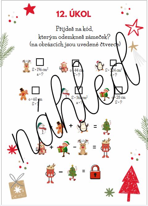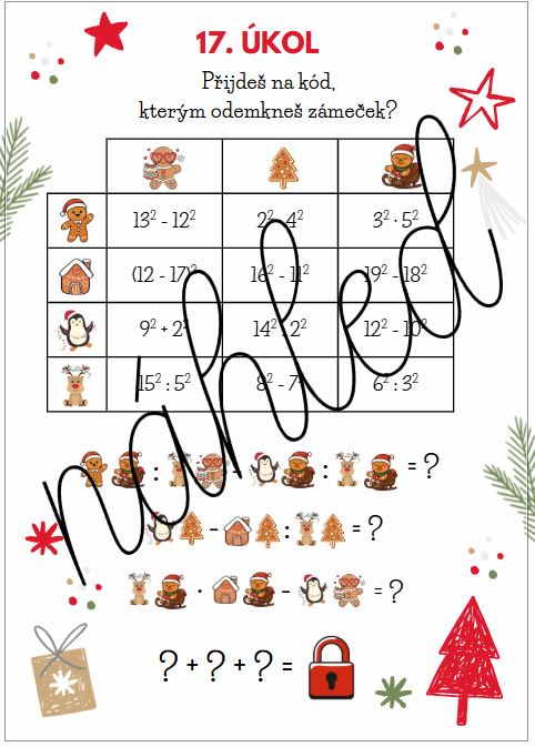 a) denní adventní forma - učitel každý den zveřejní jeden úkol (např. na nástěnce), žáci každý den po vyřešení úkolu získají jedno číslo, které si někam zapisují a nakonec je použijí v závěrečném úkolu č. 18